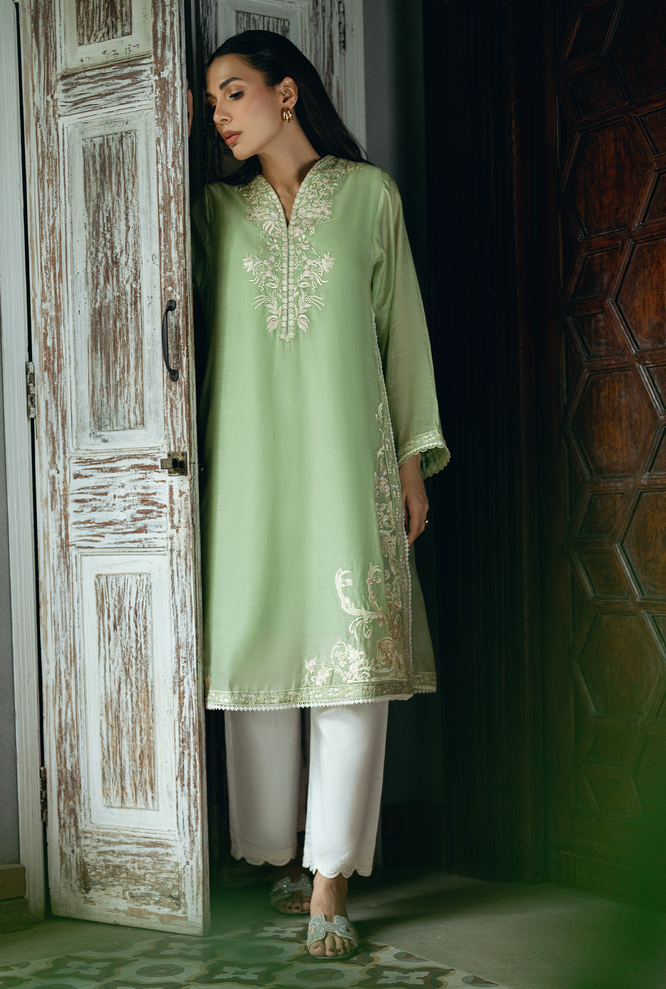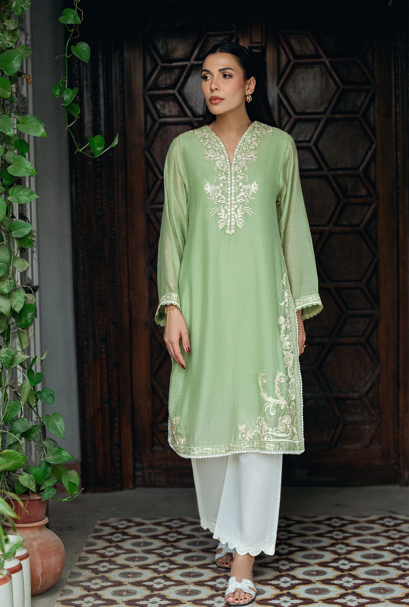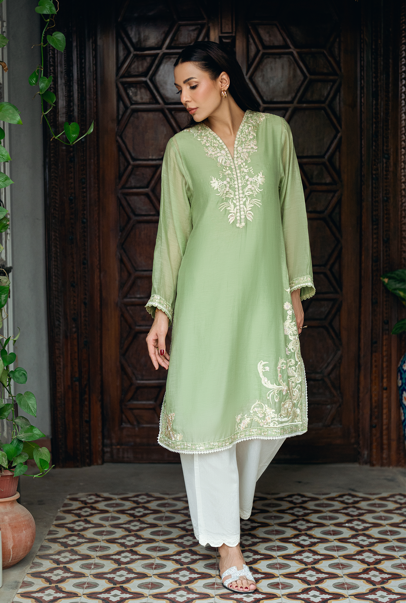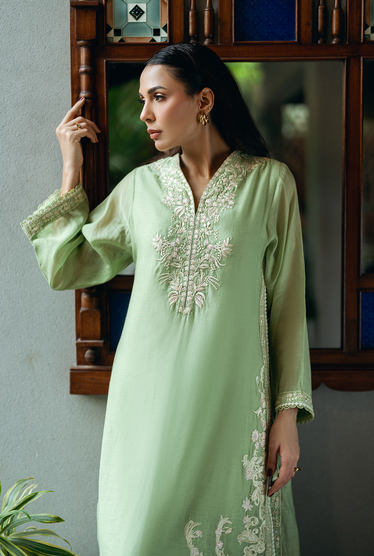 One-piece Bageecha shirt featuring intricate heavy embroidery along the V-neckline, side seams, hem, and sleeves. (Lining attached).