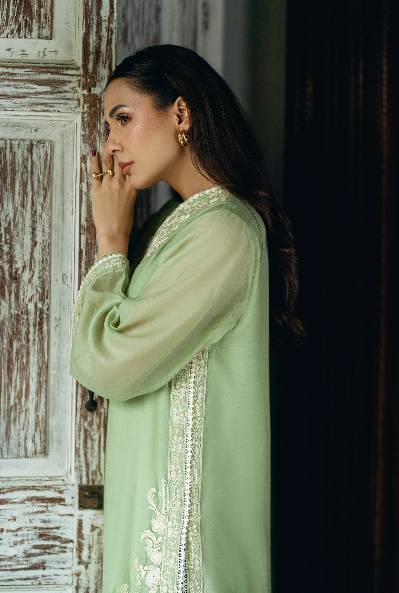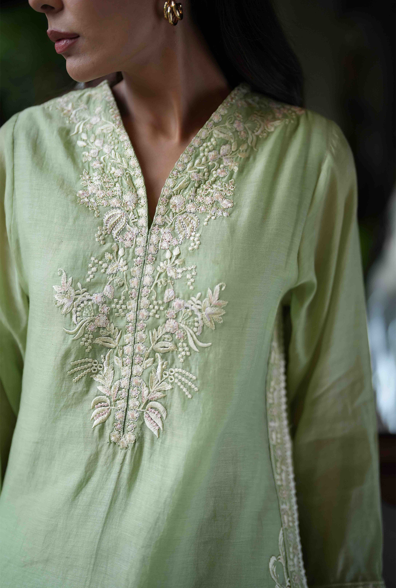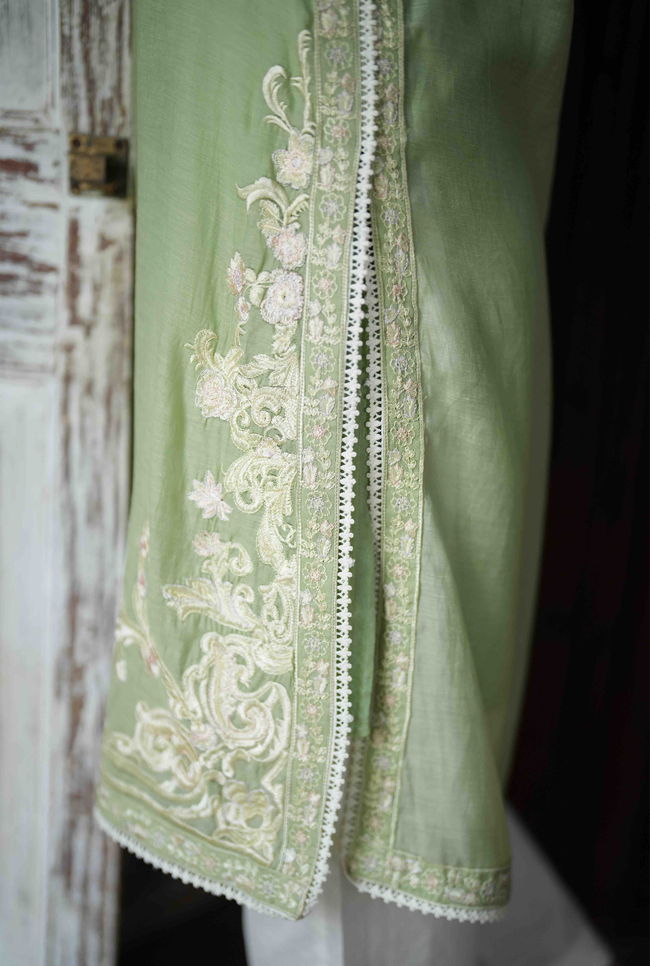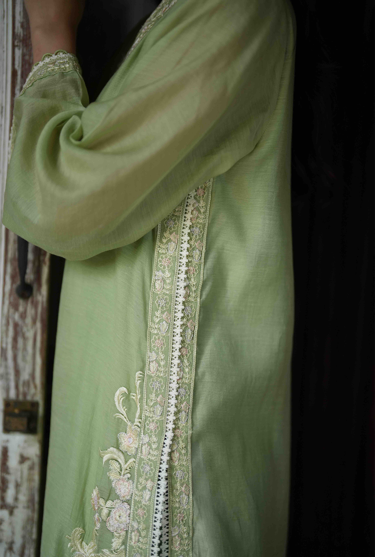 One-piece Bageecha shirt featuring intricate heavy embroidery along the V-neckline, side seams, hem, and sleeves. (Lining attached).