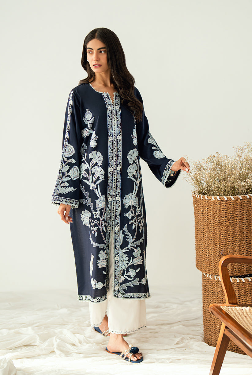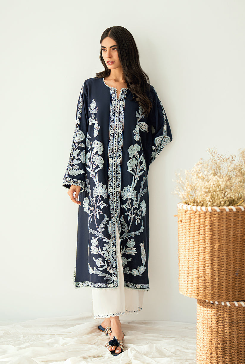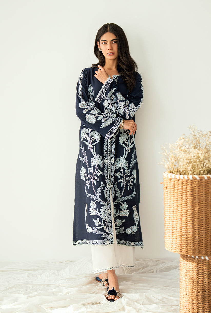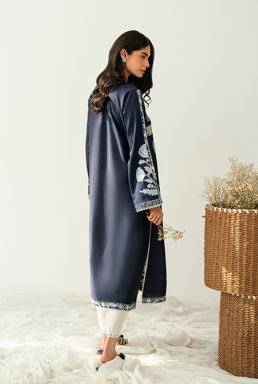 A front-open jacket adorned with all-over embroidery, delicate sleeve details, and graceful lace finishing. Made from luxurious yarn dyed cotton silk where elegance meets effortless style.