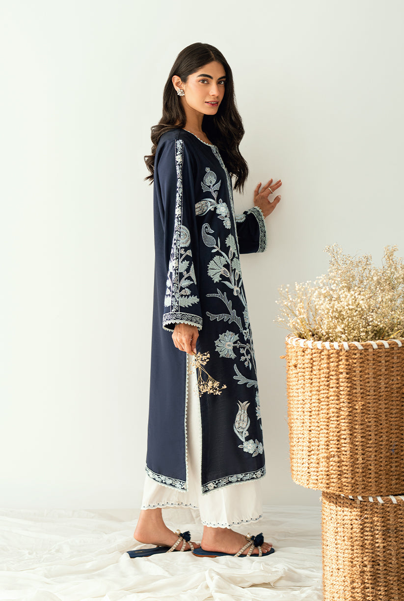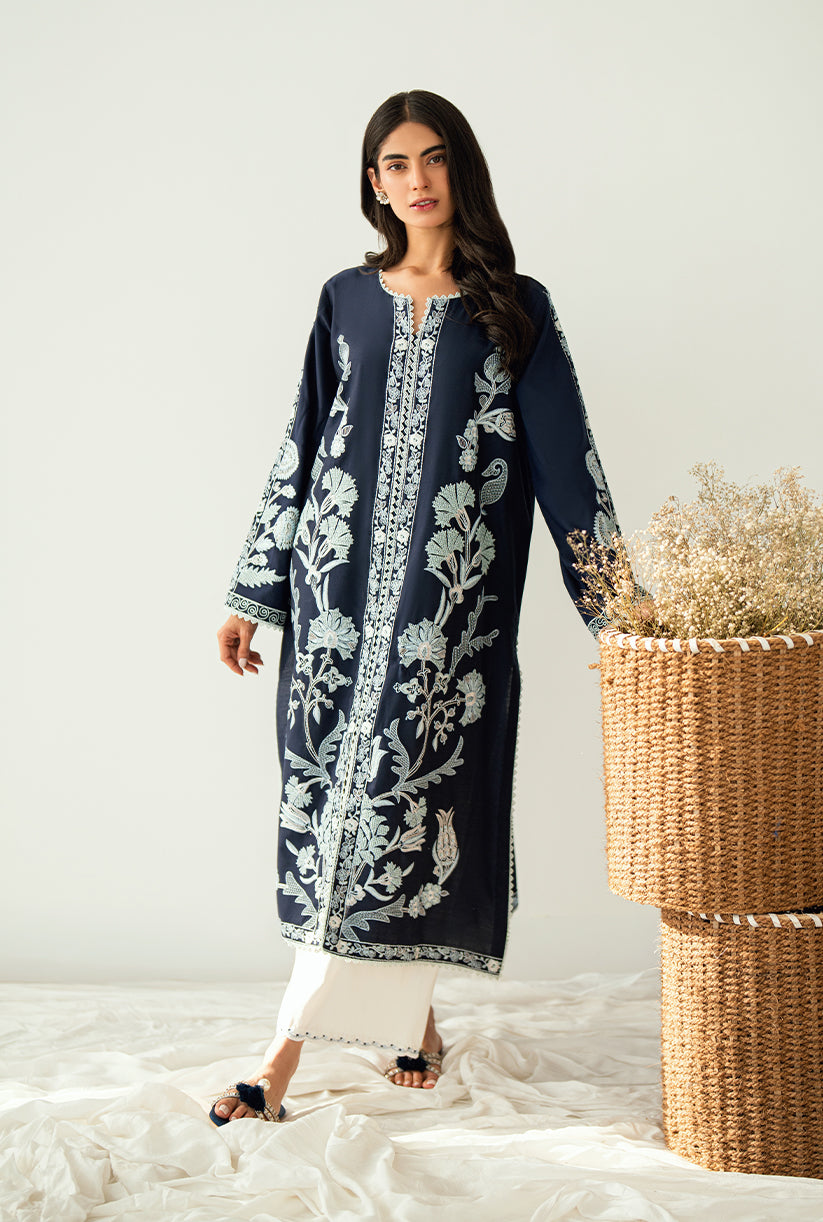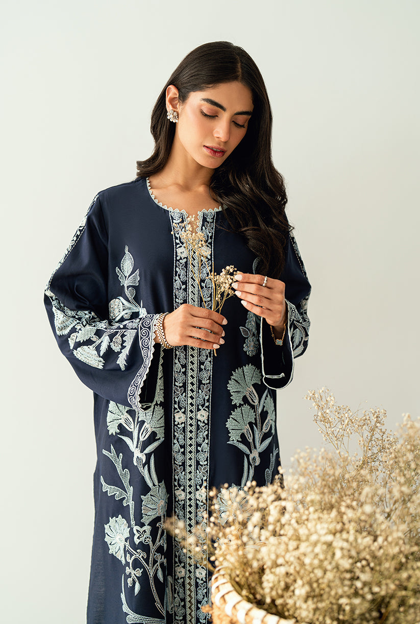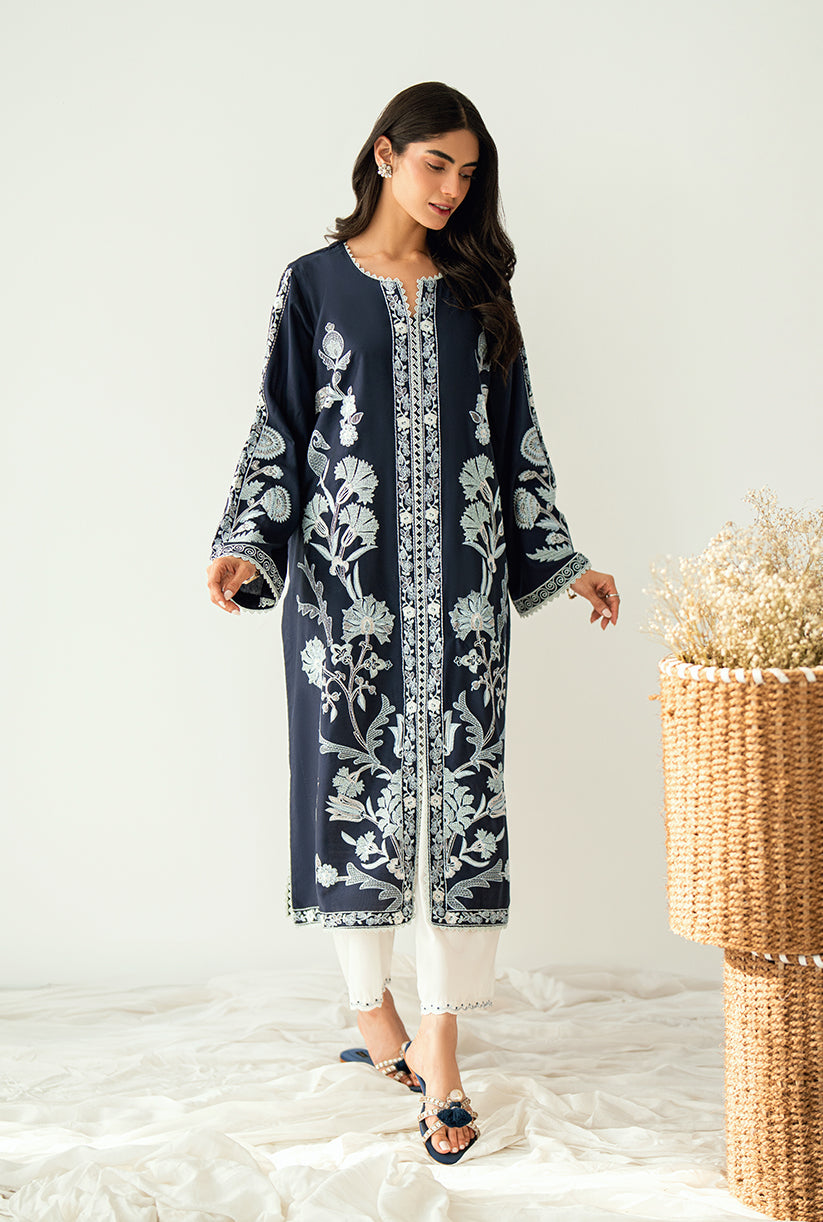 A front-open jacket adorned with all-over embroidery, delicate sleeve details, and graceful lace finishing. Made from luxurious yarn dyed cotton silk where elegance meets effortless style.