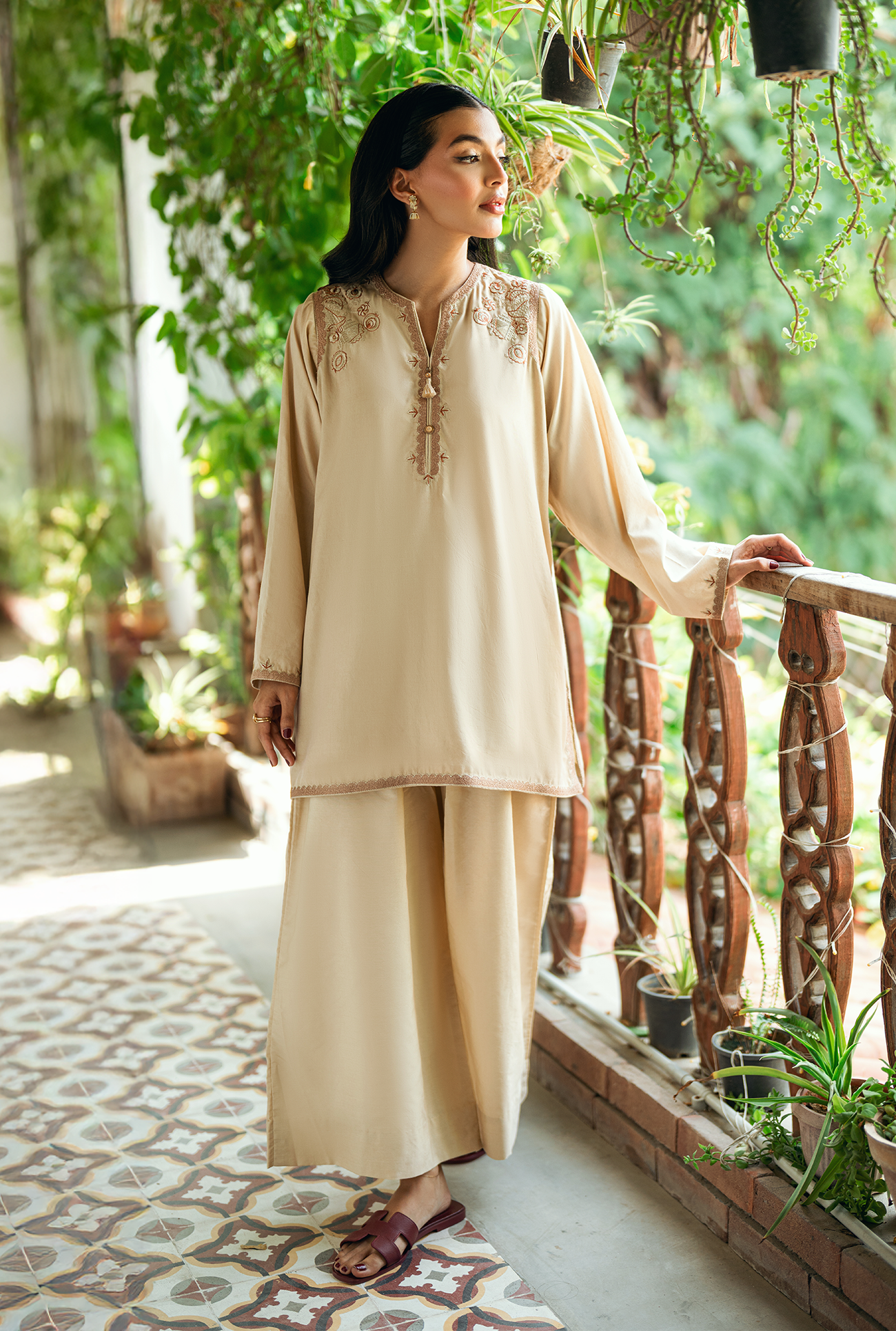 Gulzar set features a short relaxed shape kurta with an embroidered front and back neckline paired with loose culottes for an effortless casual feel. Model is wearing Small size