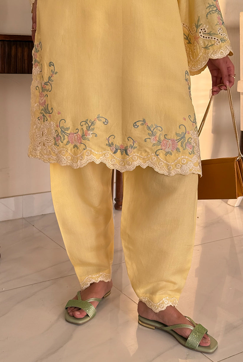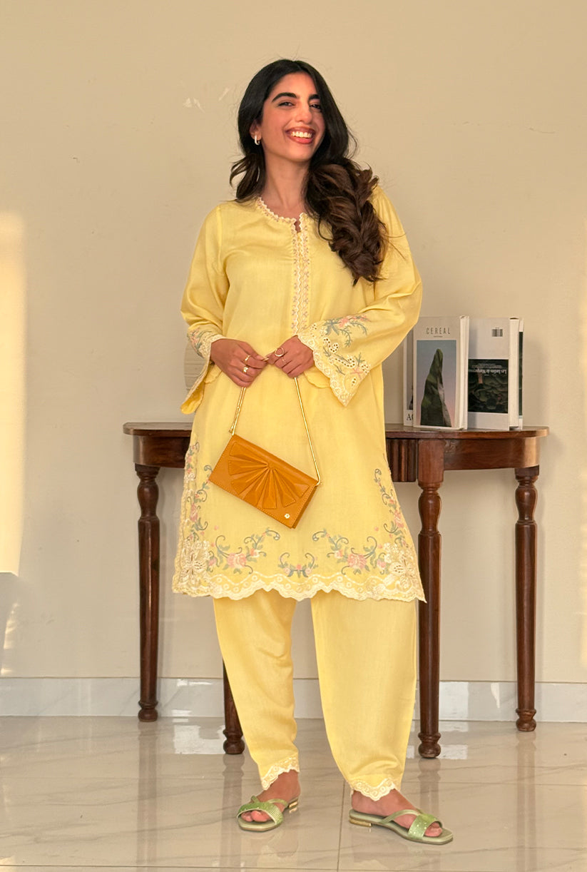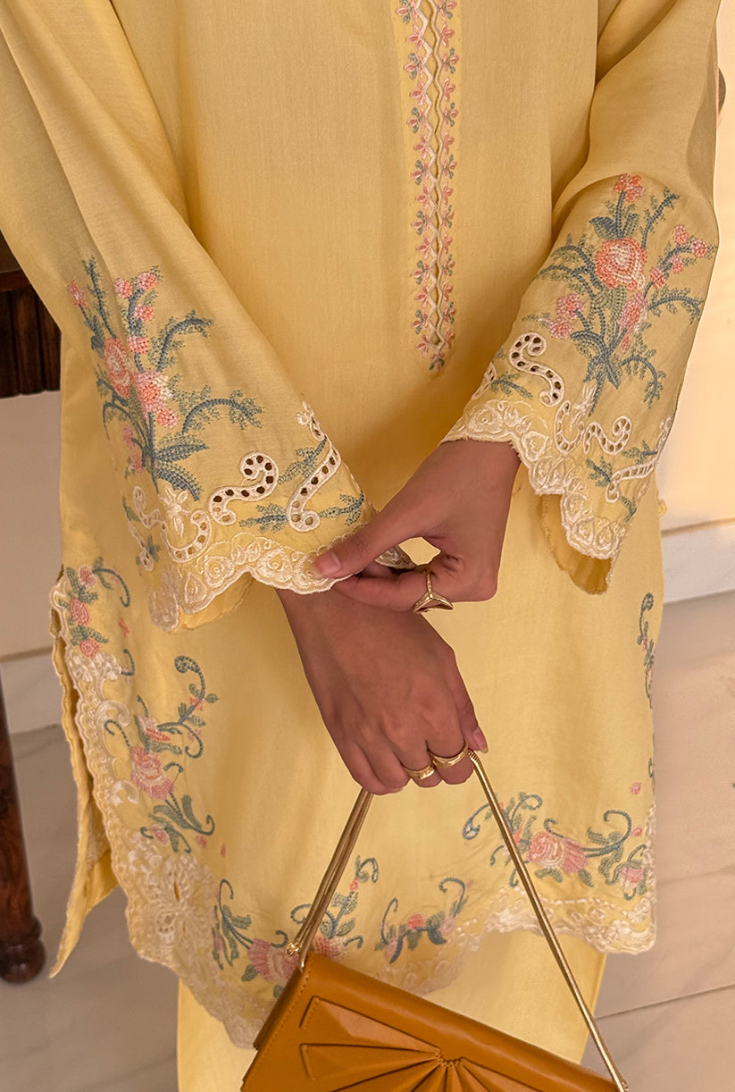 Marigold is adorned with intricate cross-stitch and delicate cutwork embroidery on the front, complemented by a finely detailed border and a graceful neckline. The short shirt is crafted from premium, pure staple fabric and paired with a classic shalwar, making this ensemble a refined choice to update your look and elevate your wardrobe.