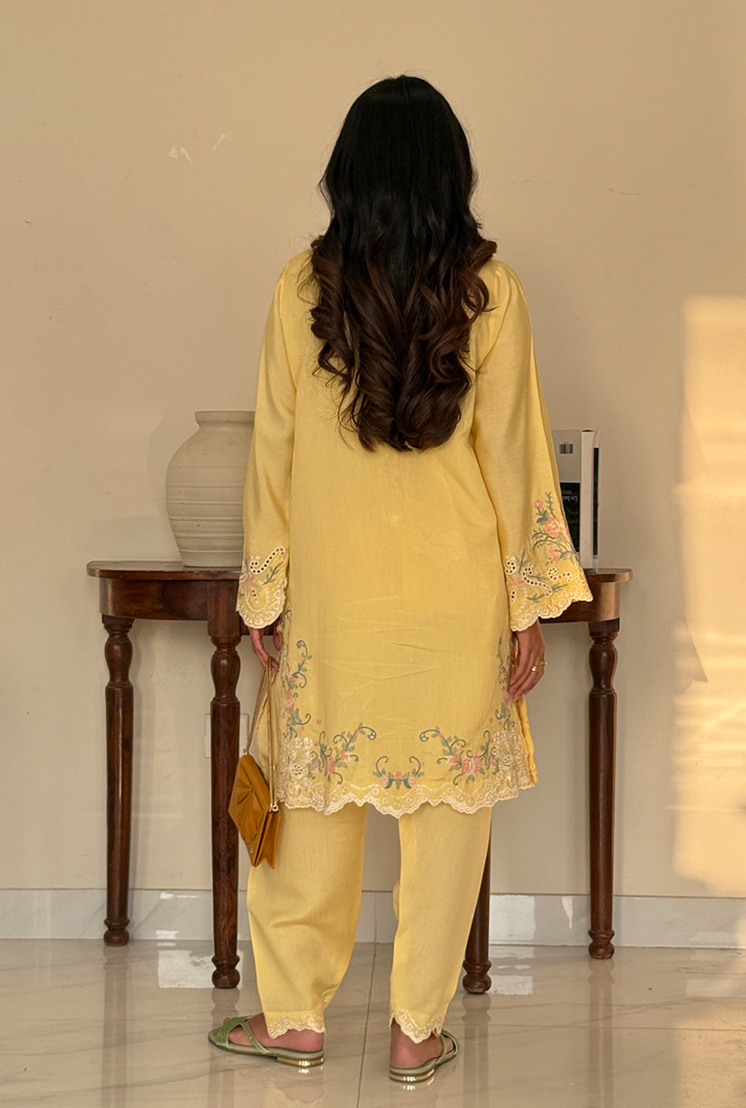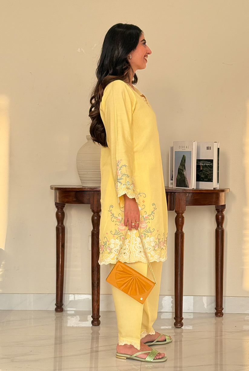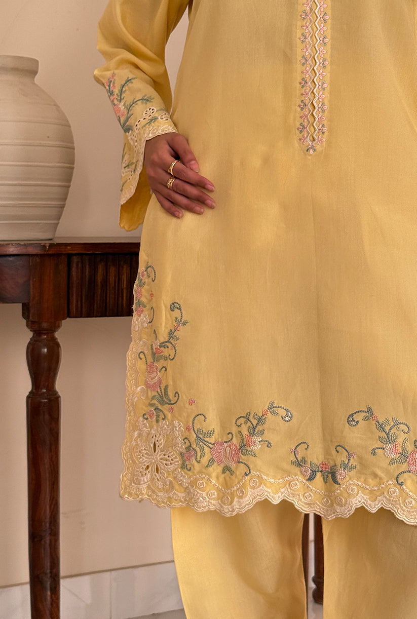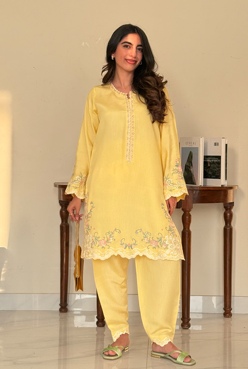 Marigold is adorned with intricate cross-stitch and delicate cutwork embroidery on the front, complemented by a finely detailed border and a graceful neckline. The short shirt is crafted from premium, pure staple fabric and paired with a classic shalwar, making this ensemble a refined choice to update your look and elevate your wardrobe.