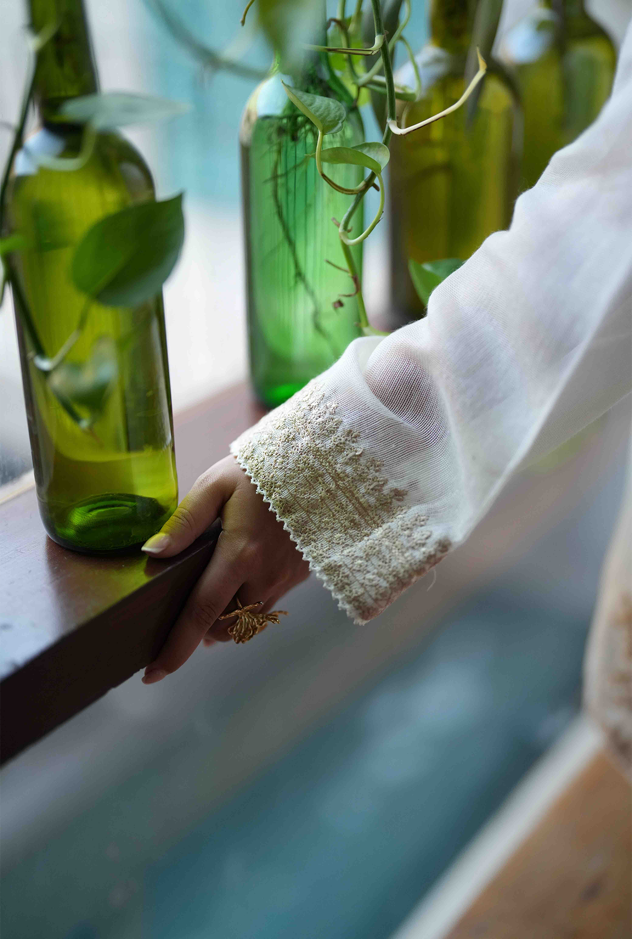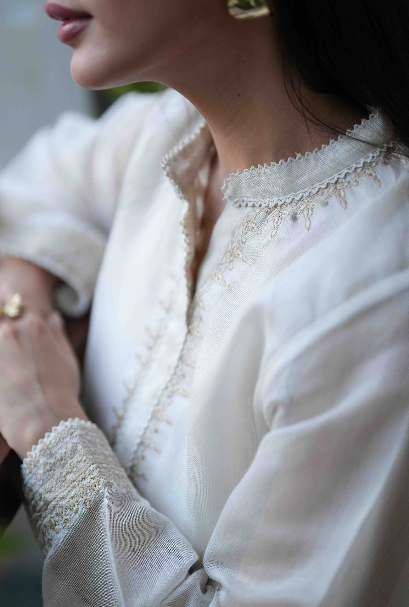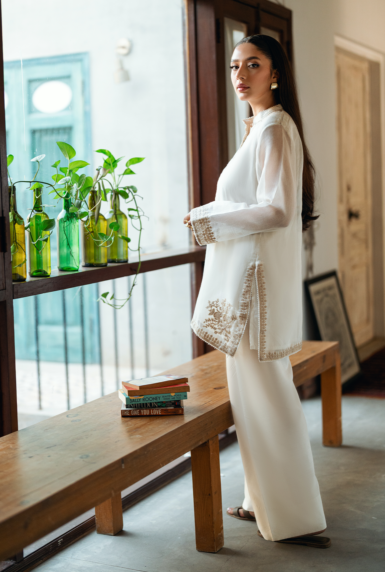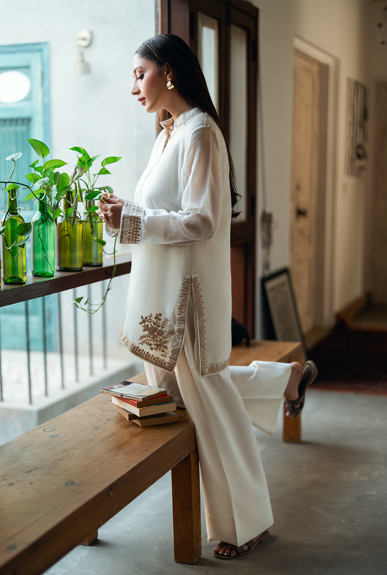Nazam set features an embroidered front with band collar and kurta patti. It is crafted from cotton net paired with loose fit shalwar. It is everything you need to elevate your wardrobe. Model is wearing Small size