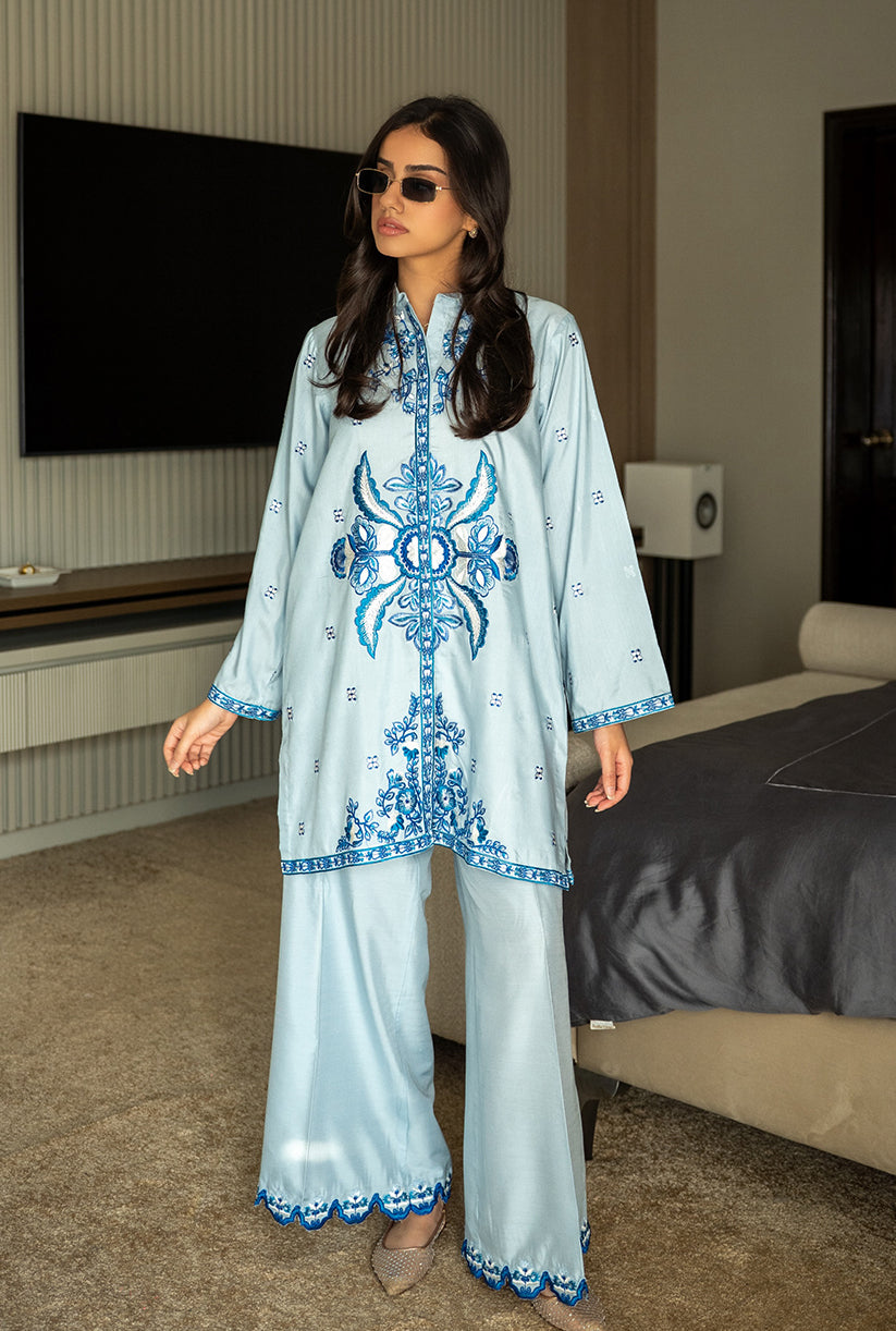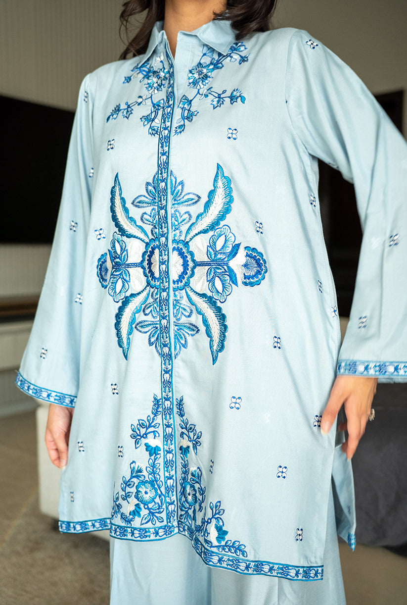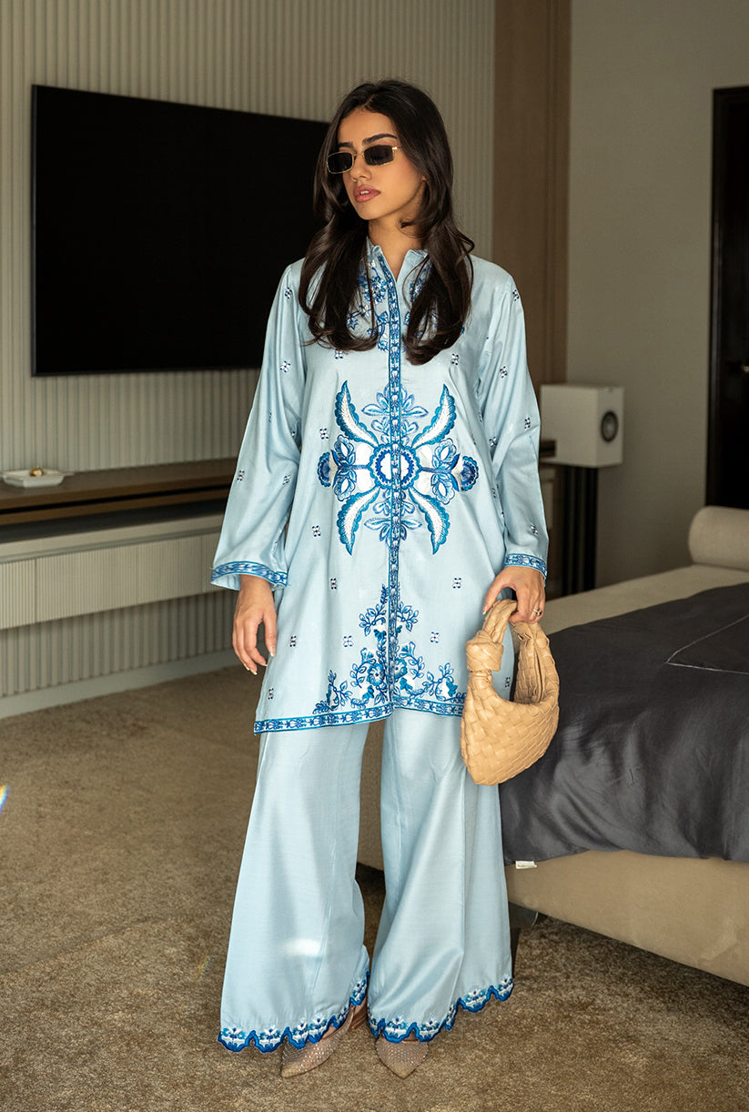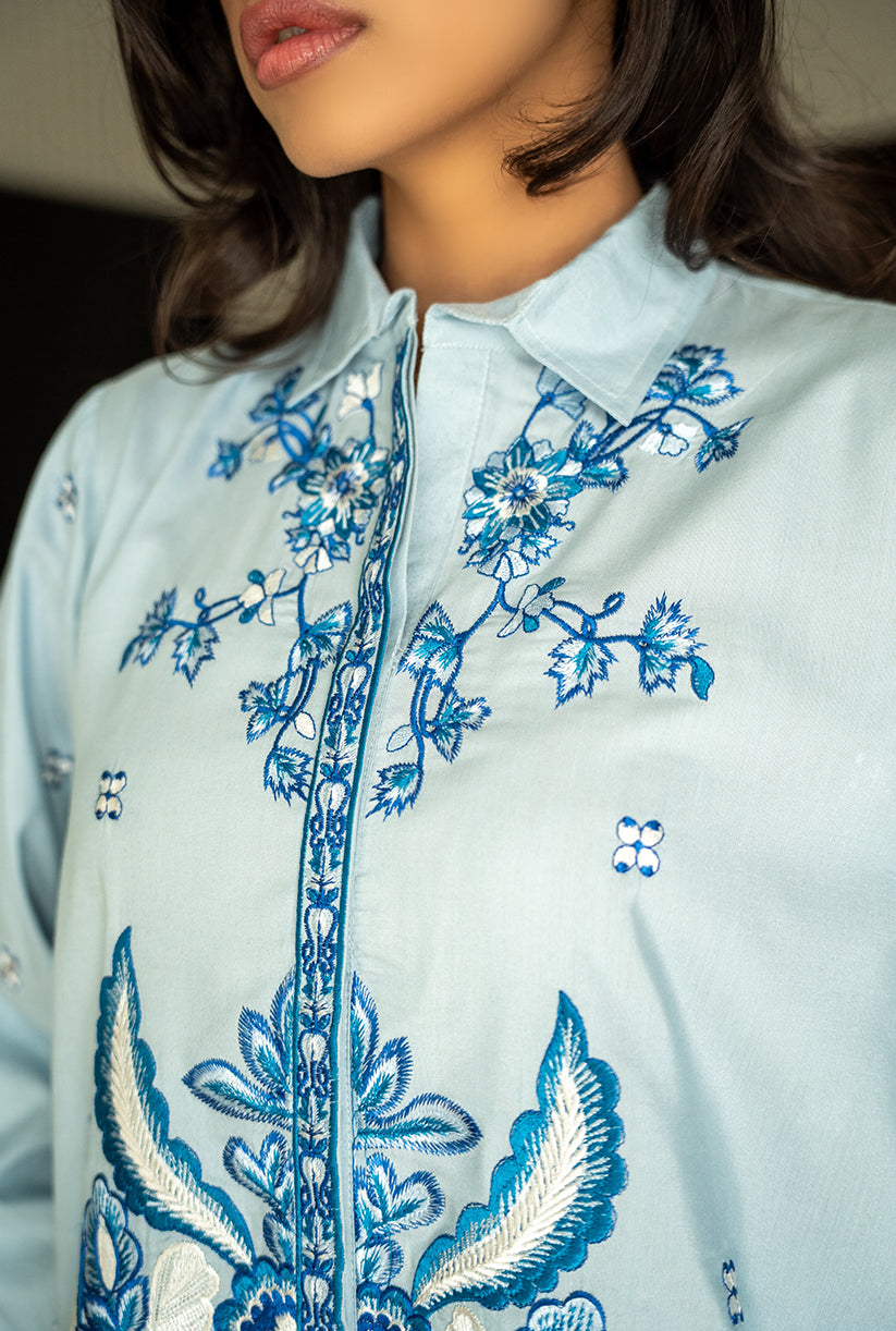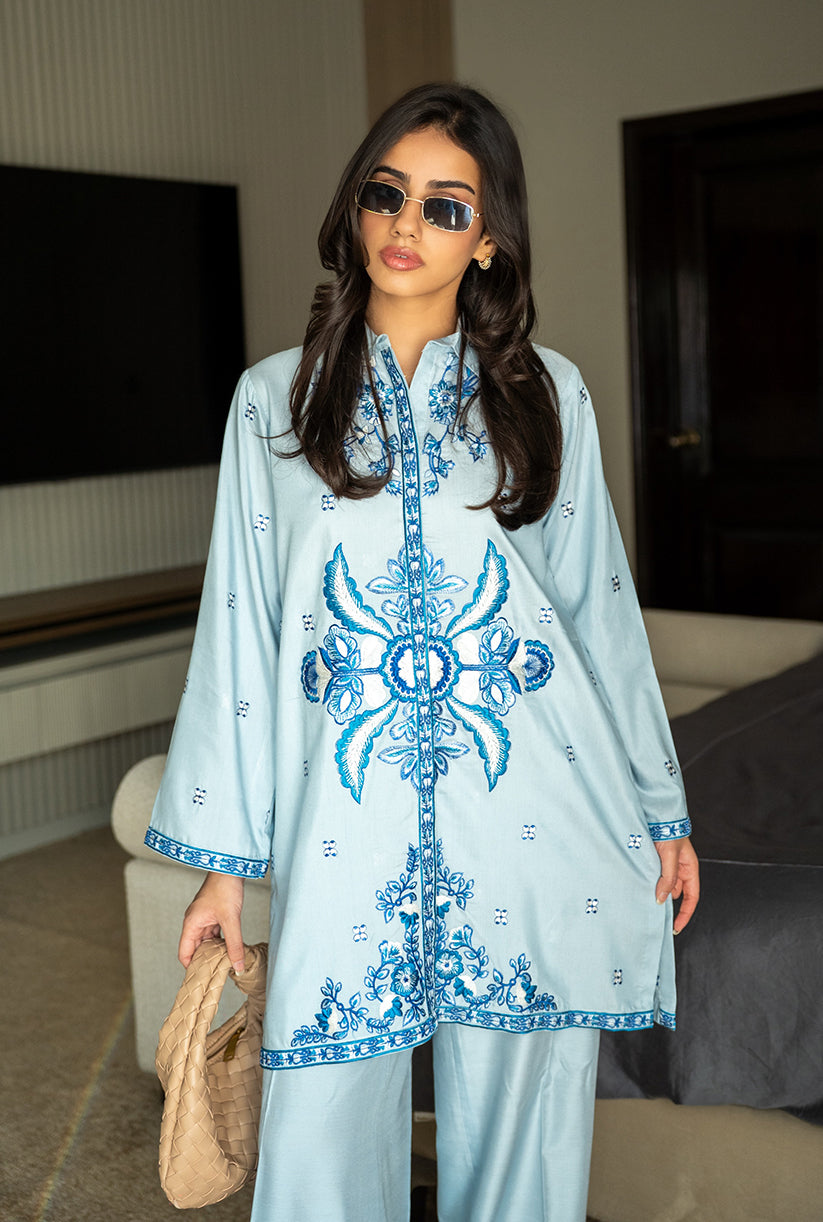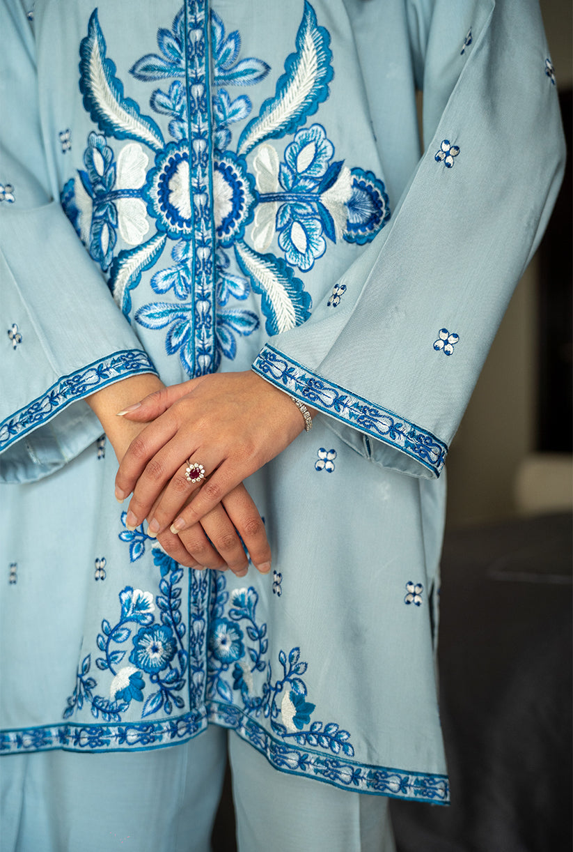 Ocean Empress is your go-to look for modern elegance. This delicate short shirt features exquisite blue embroidery on the front and refined straight sleeves, beautifully paired with classic, tailored culottes for a graceful and contemporary silhouette.