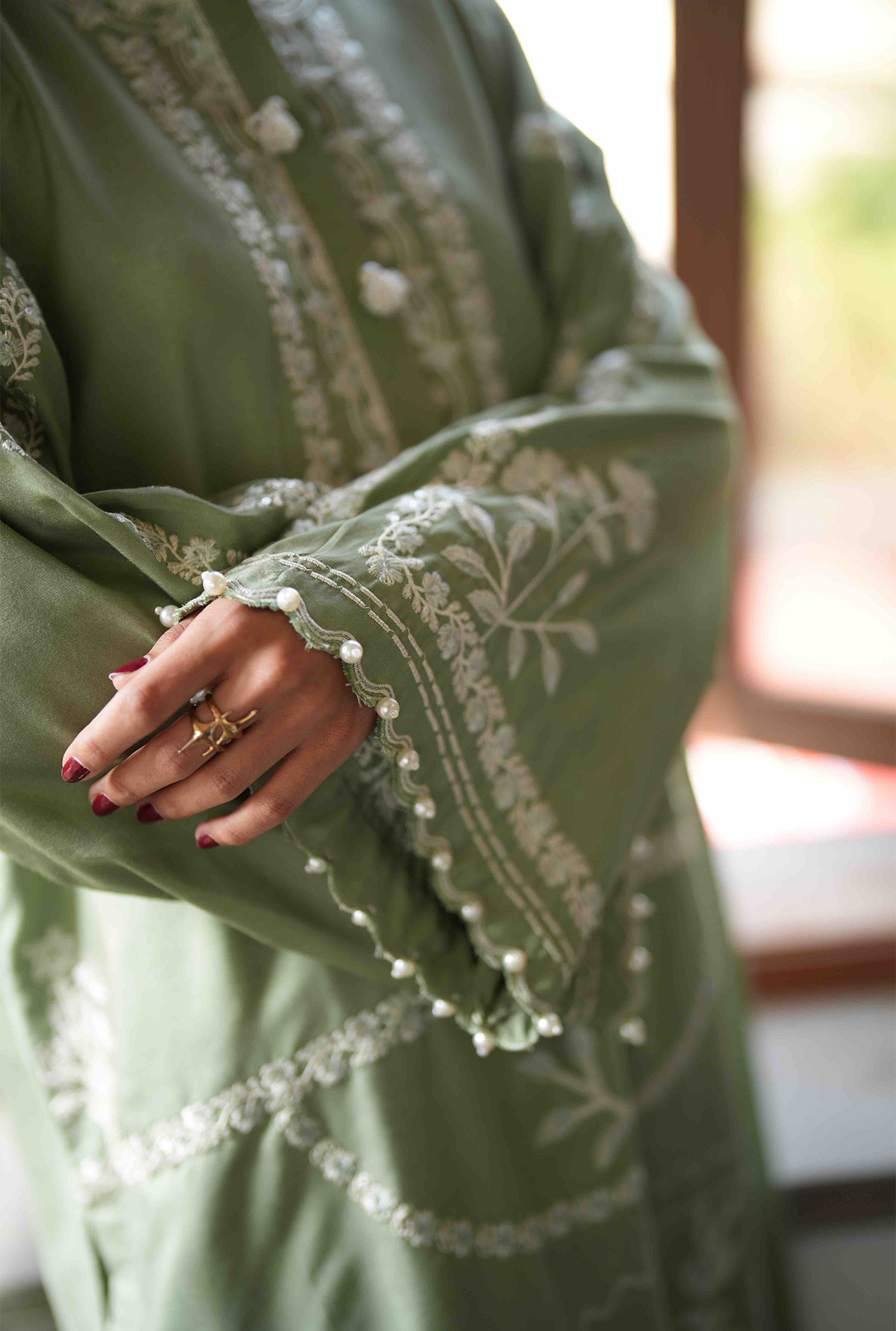 A long shirt adorned with heavy all-over embroidery, featuring a Basics round neckline with a button placket accented by tassels, full sleeves with pearl detailing, paired with wide culottes. Model is wearing Small size