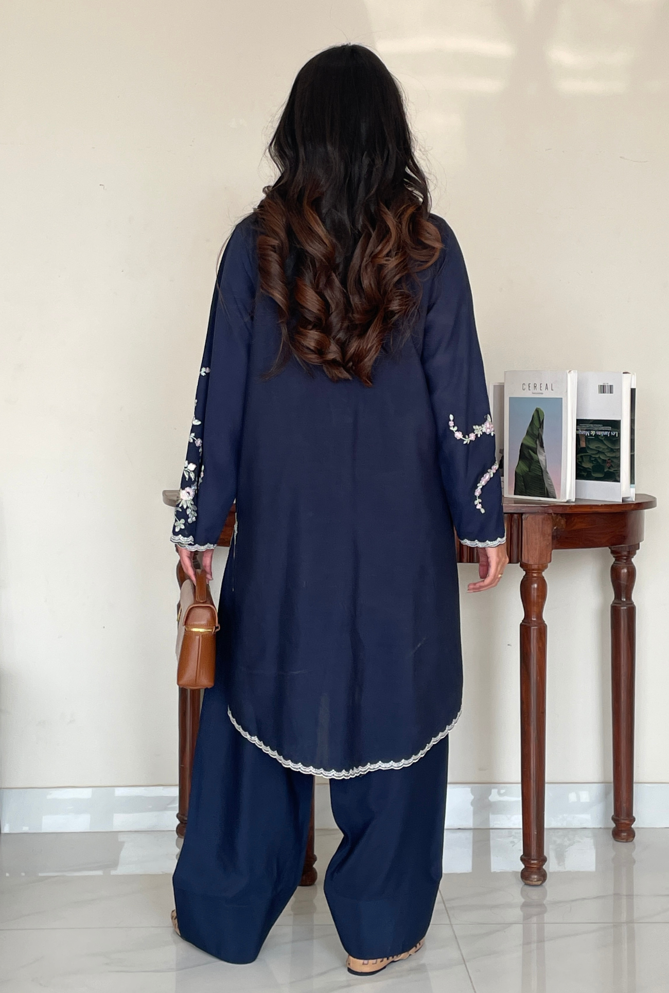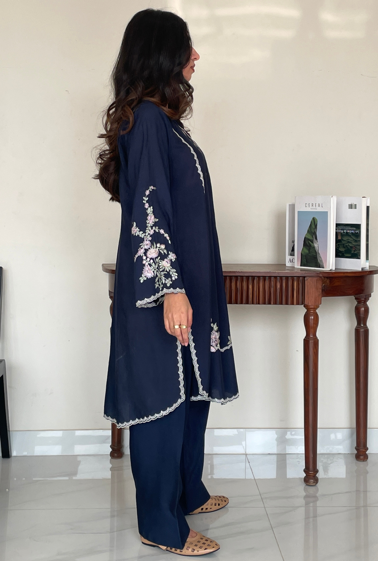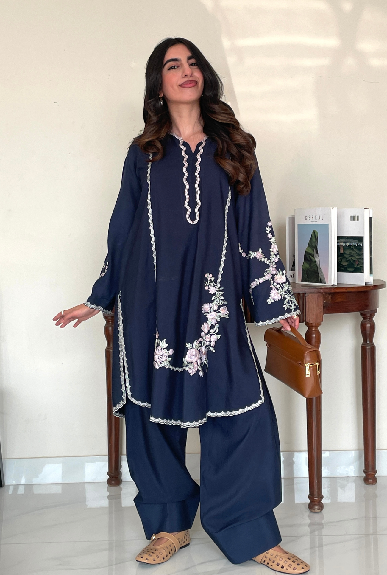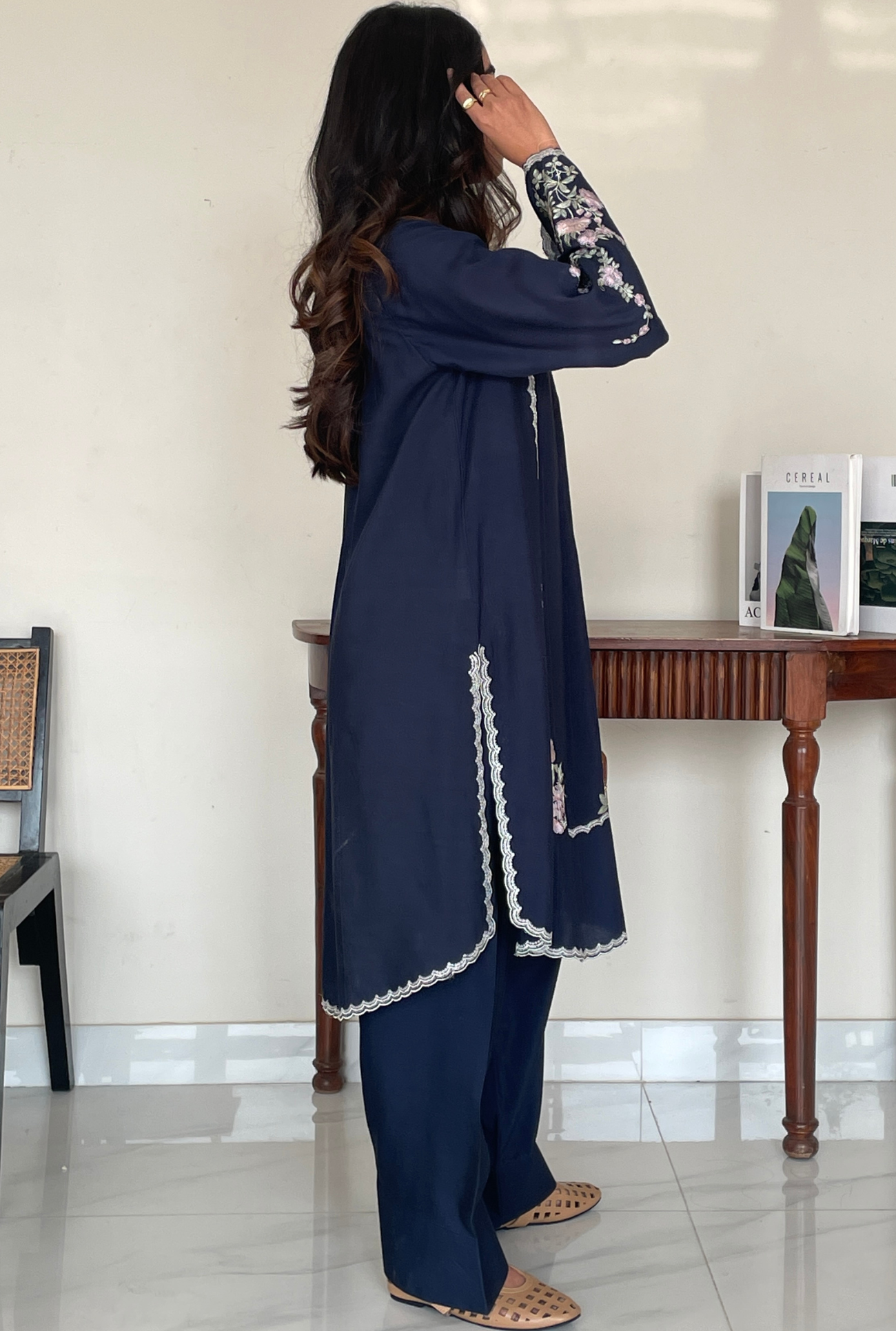 Sapphire set features a Beautiful embroidered front with, scallop border and pintax detailing on neck, It is crafted from Cotton silk paired Farshi Shalwar.