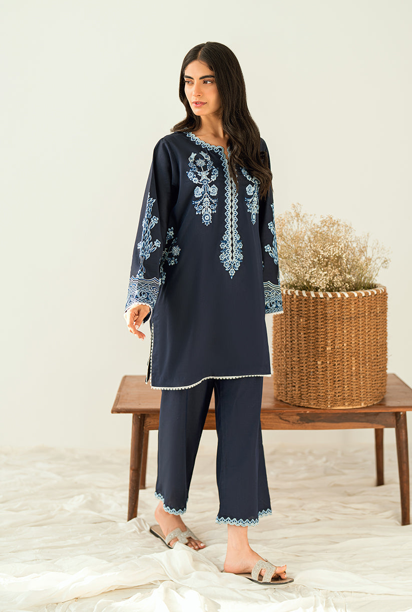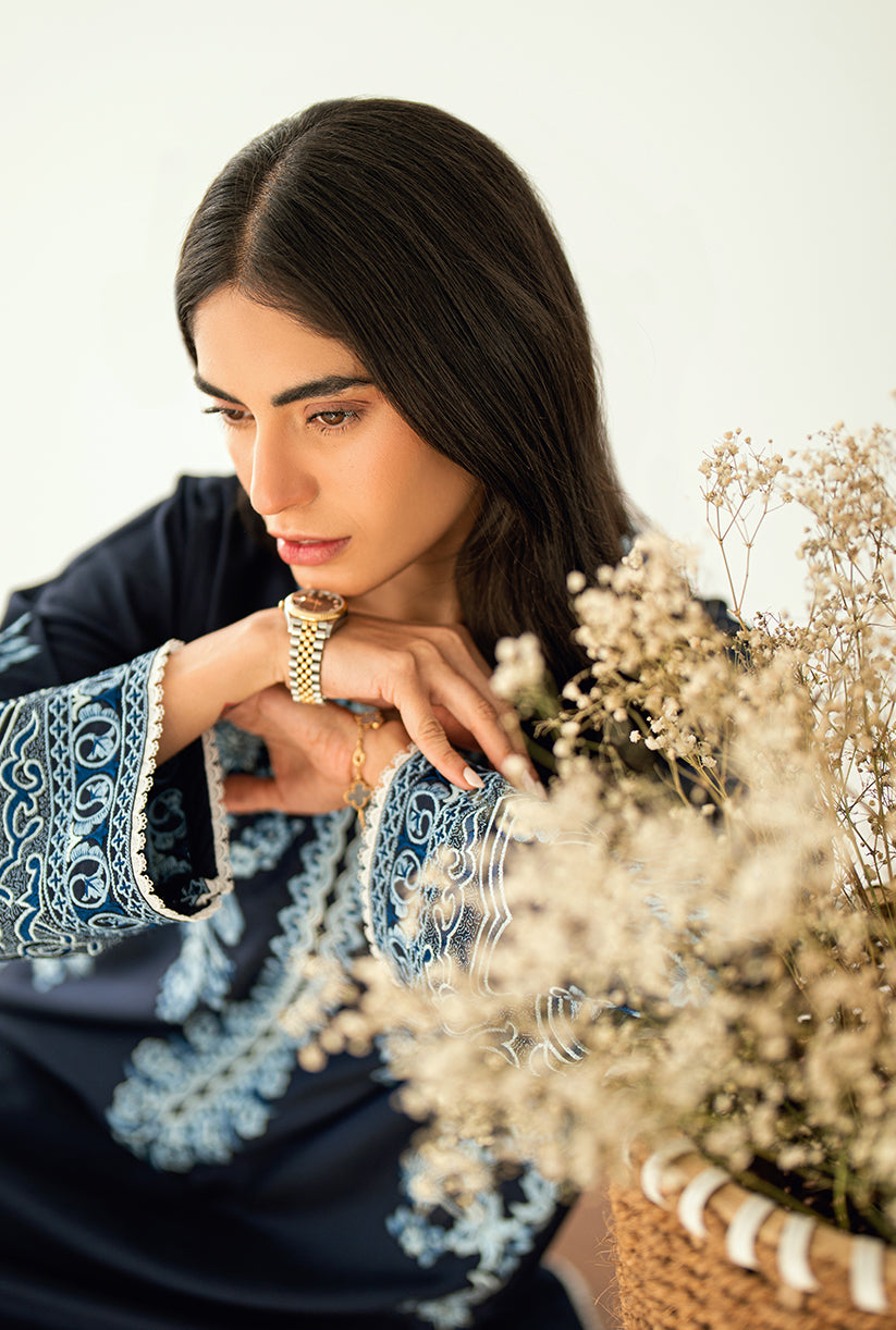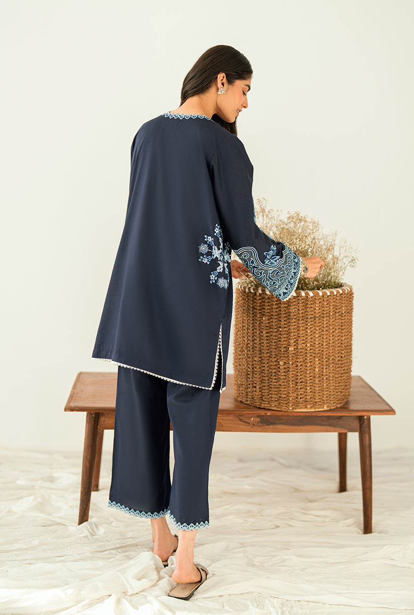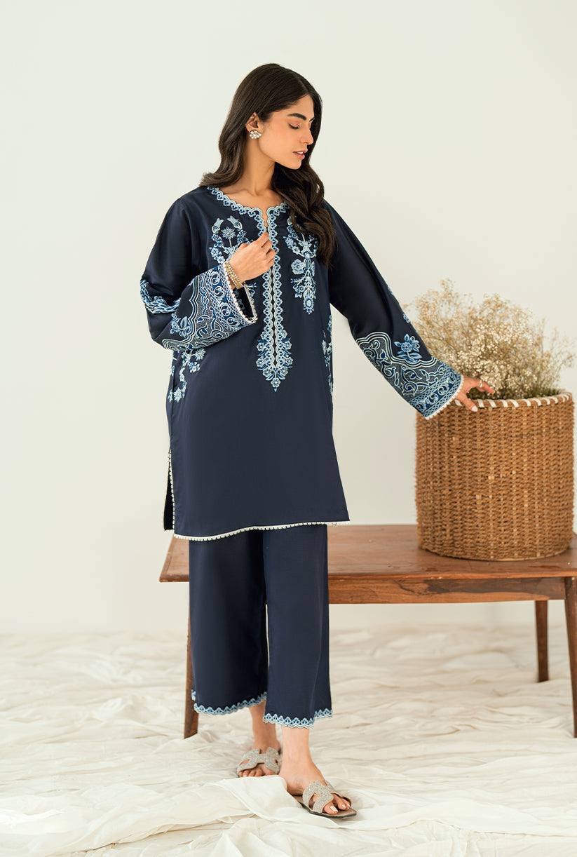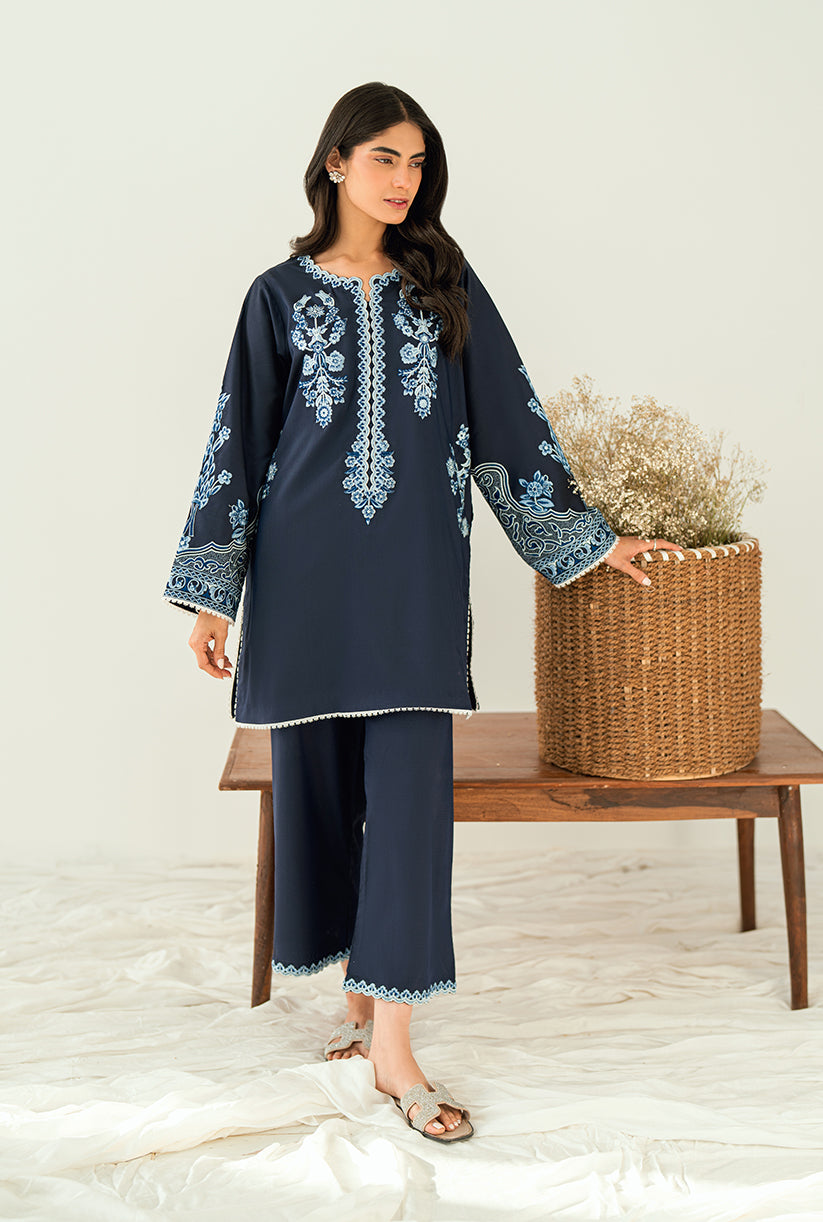 Sea Shore showcases a delicately embroidered front, a finely crafted Neckline and the overall sleeves embroidery. Designed in premium Yarn Dyed cotton silk, the Short shirt is paired with Culottes for an effortlessly chic look. This outfit is your go-to choice to refresh your style and uplift your wardrobe.