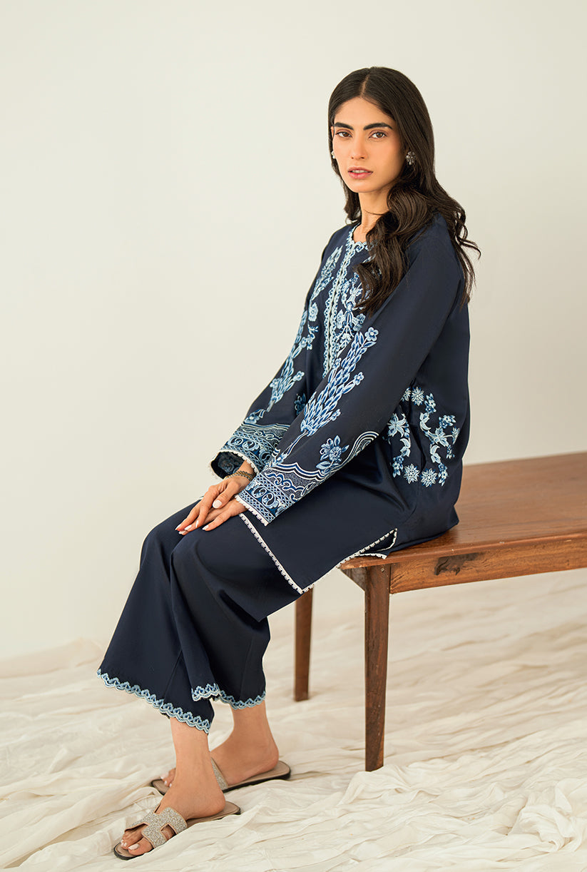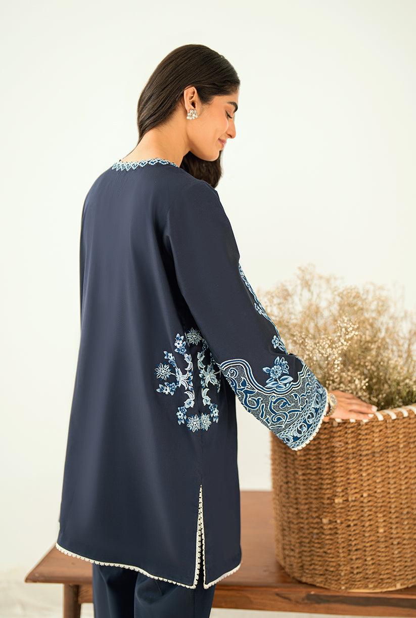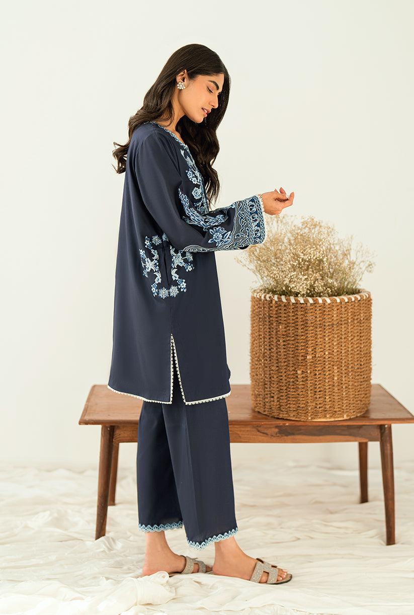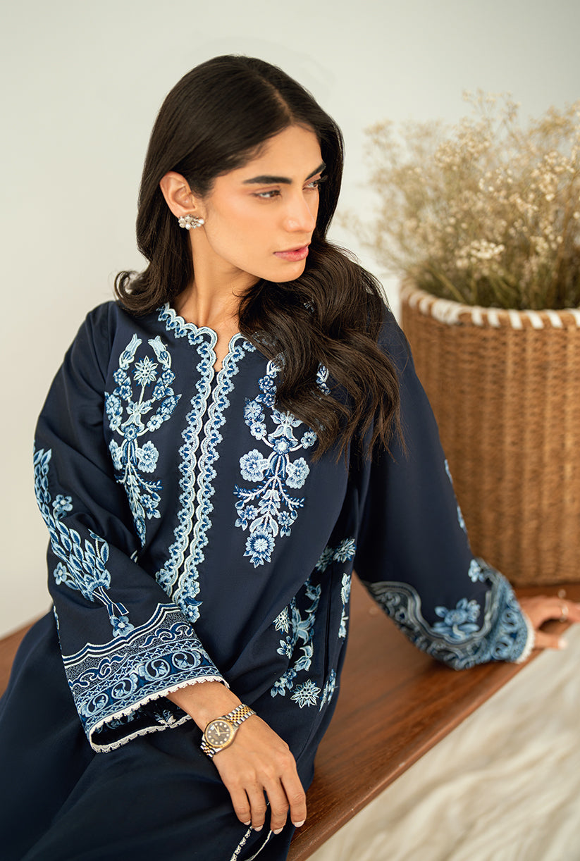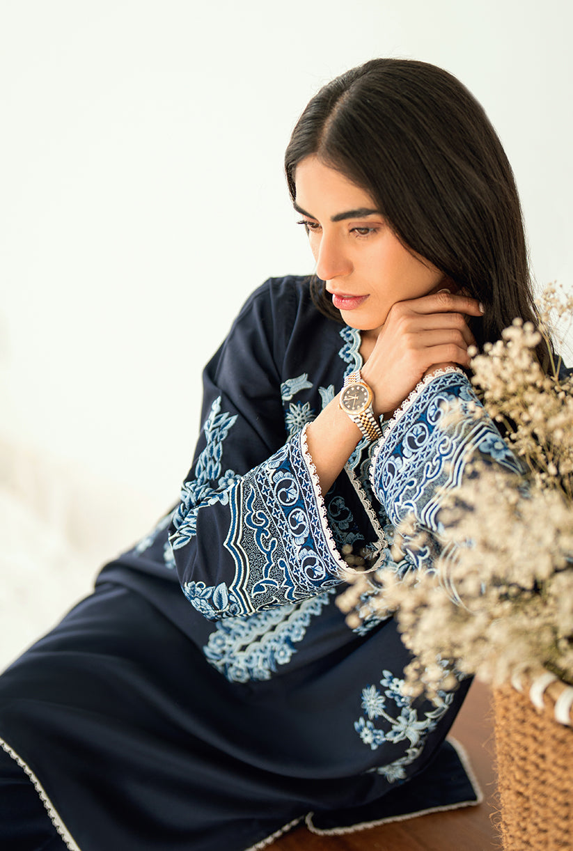 Sea Shore showcases a delicately embroidered front, a finely crafted Neckline and the overall sleeves embroidery. Designed in premium Yarn Dyed cotton silk, the Short shirt is paired with Culottes for an effortlessly chic look. This outfit is your go-to choice to refresh your style and uplift your wardrobe.