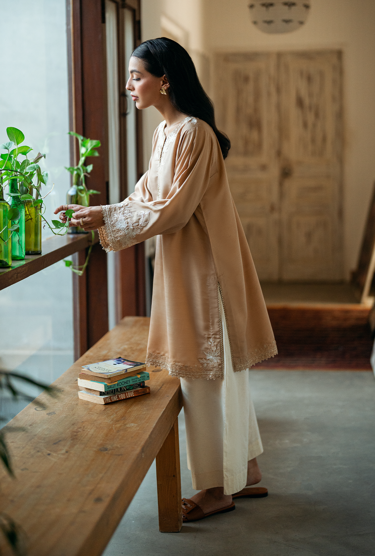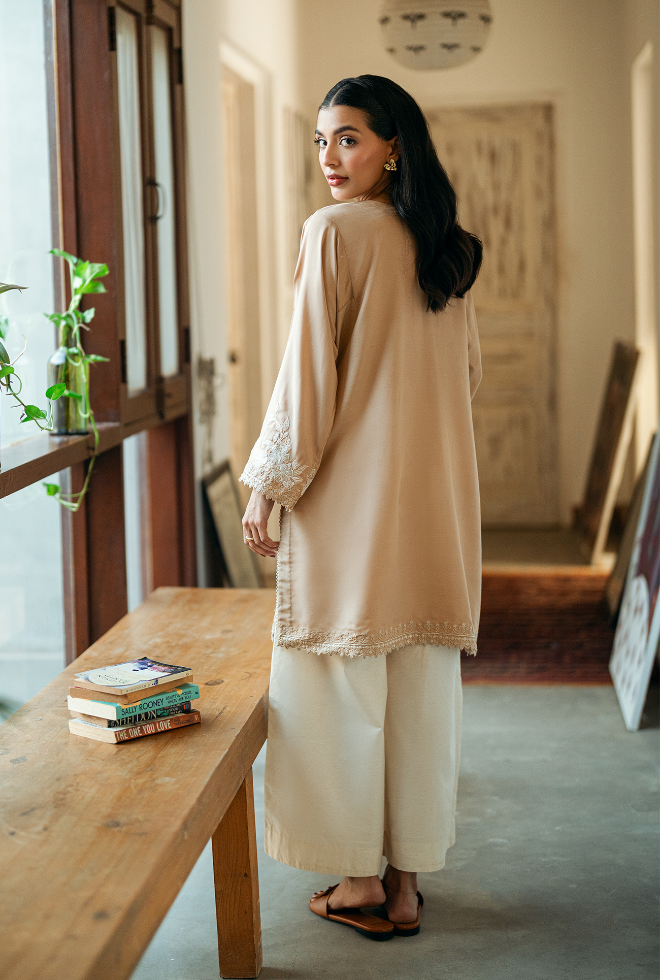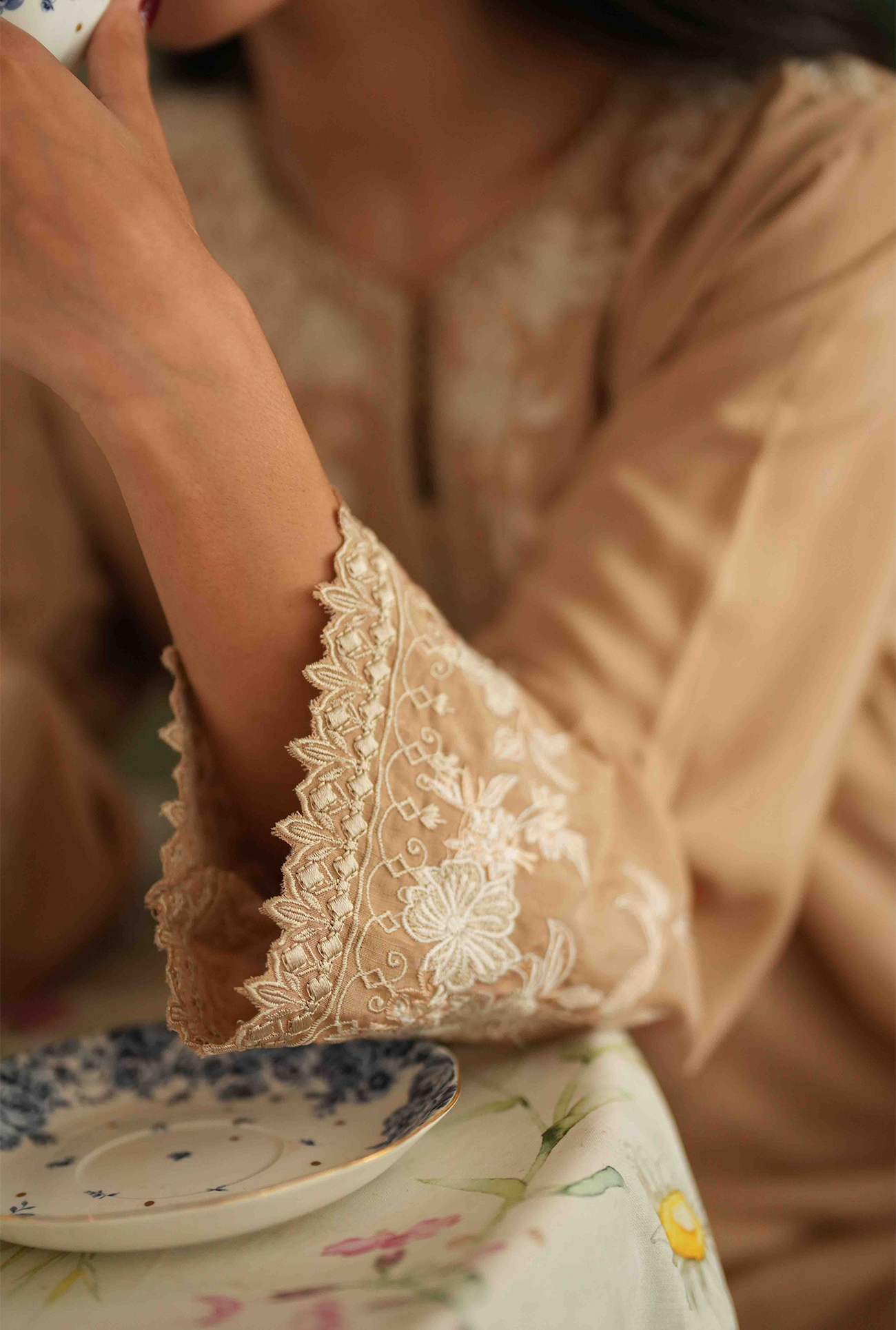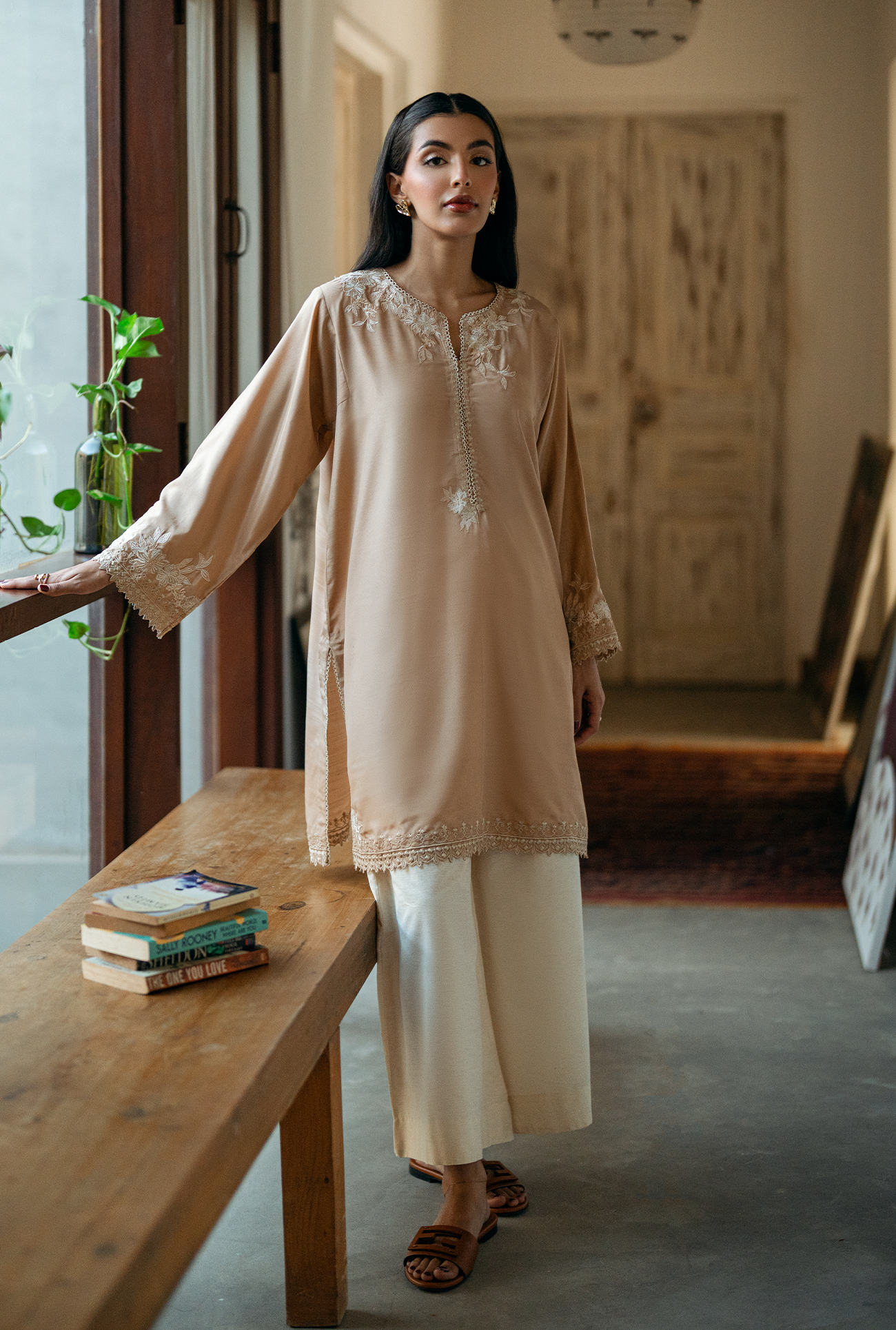 Sehra one-piece featuring a round neckline with a V-slit, mid-length silhouette with a regular fit, and delicate embroidery with cutwork around the neckline, sleeve and hem. Model is wearing Small size