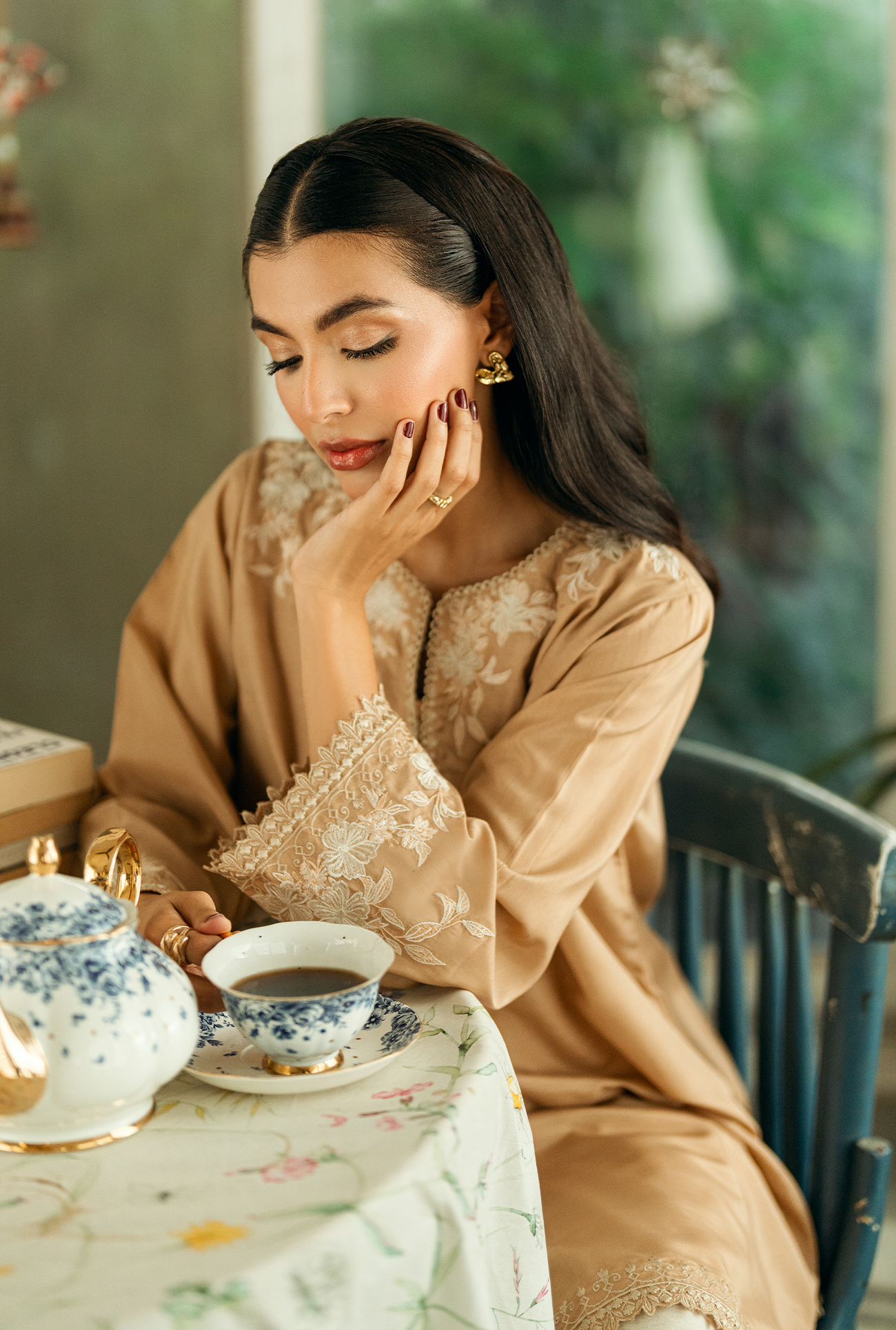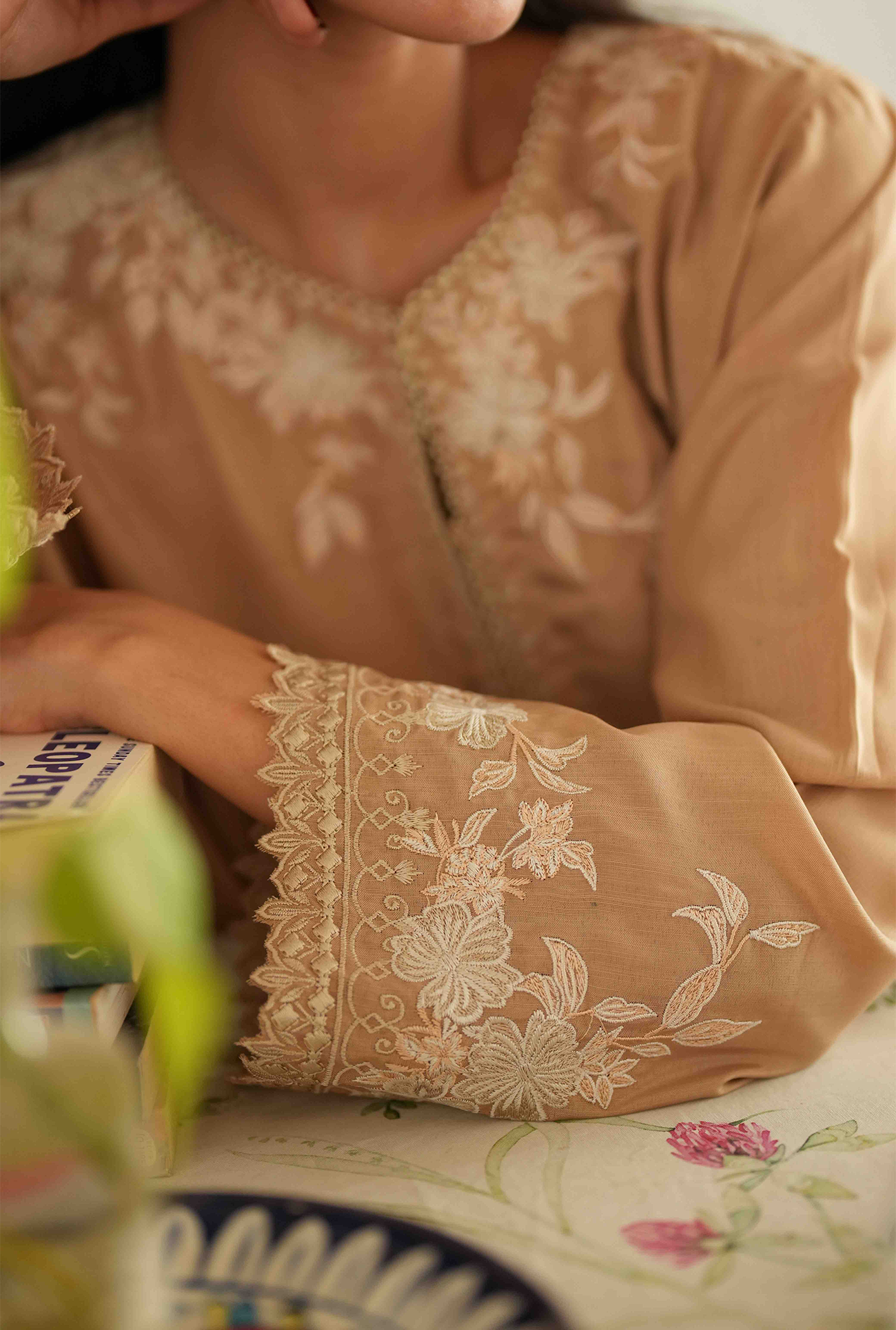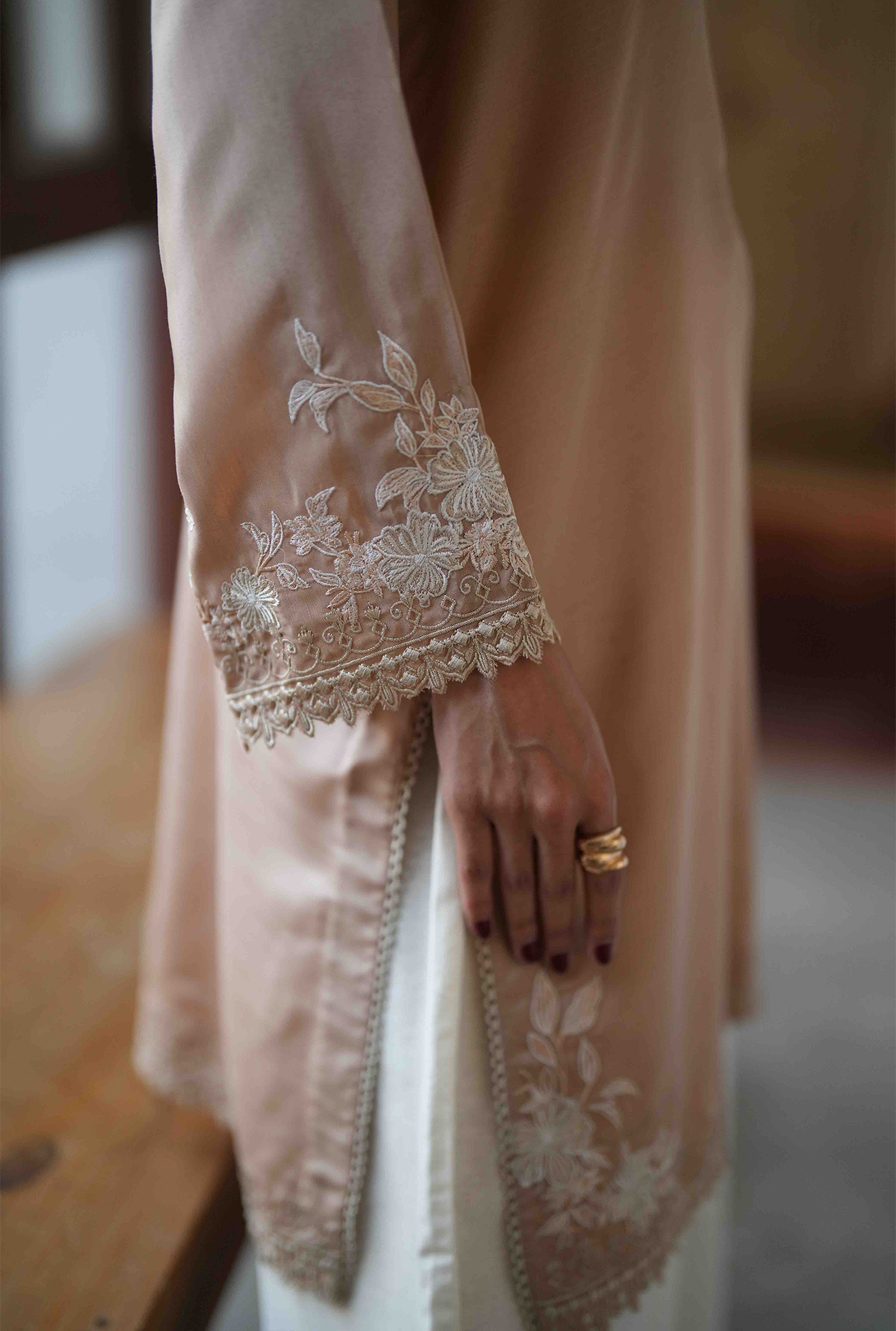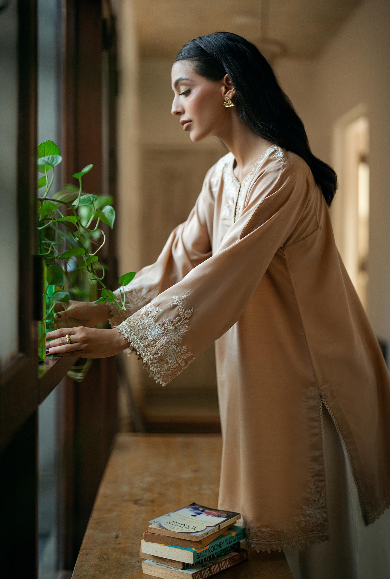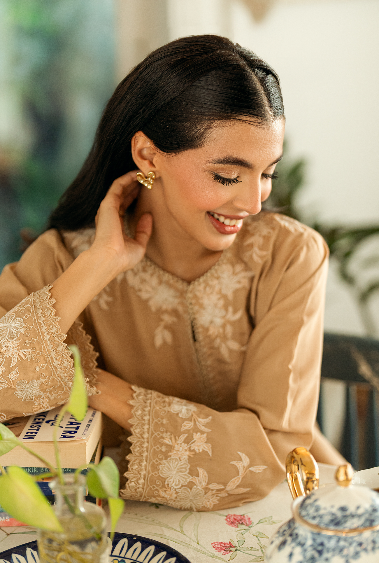 Sehra one-piece featuring a round neckline with a V-slit, mid-length silhouette with a regular fit, and delicate embroidery with cutwork around the neckline, sleeve and hem. Model is wearing Small size
