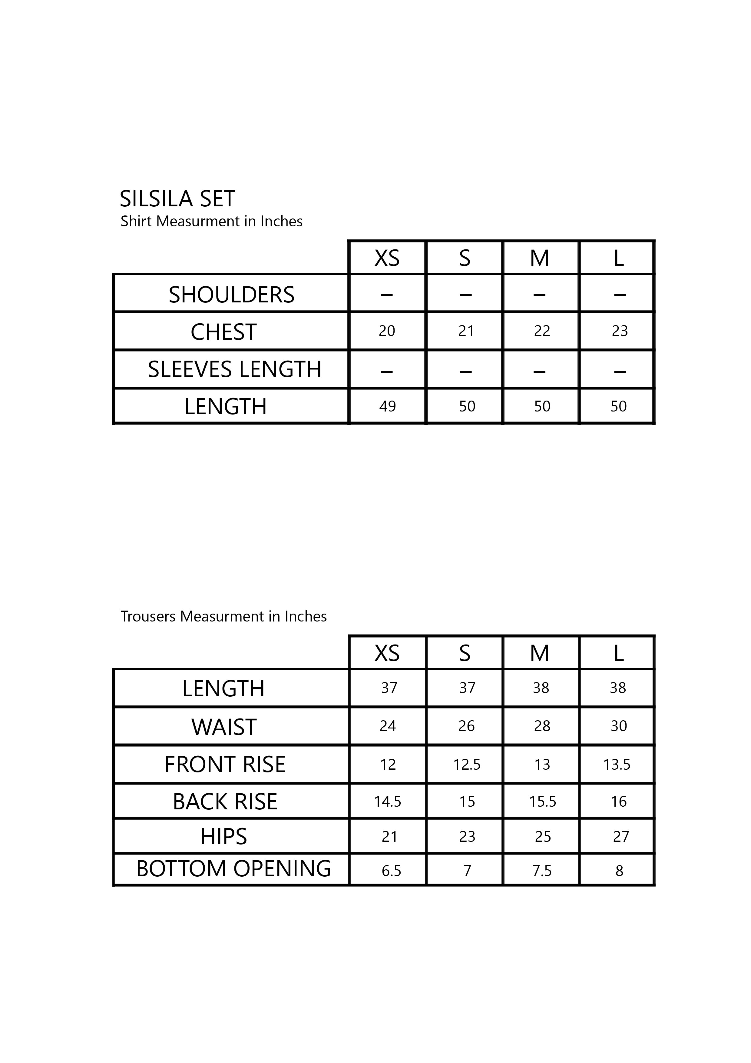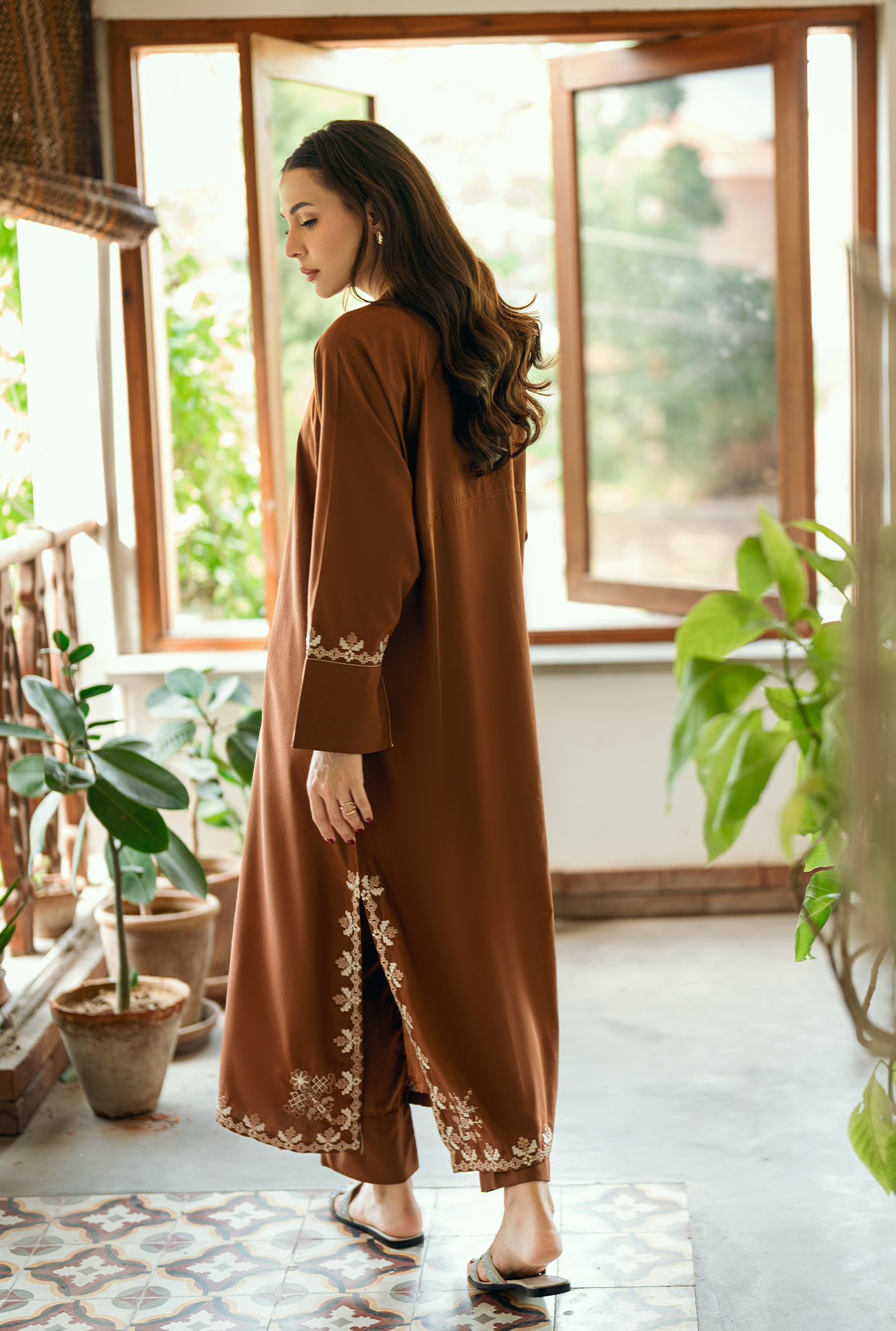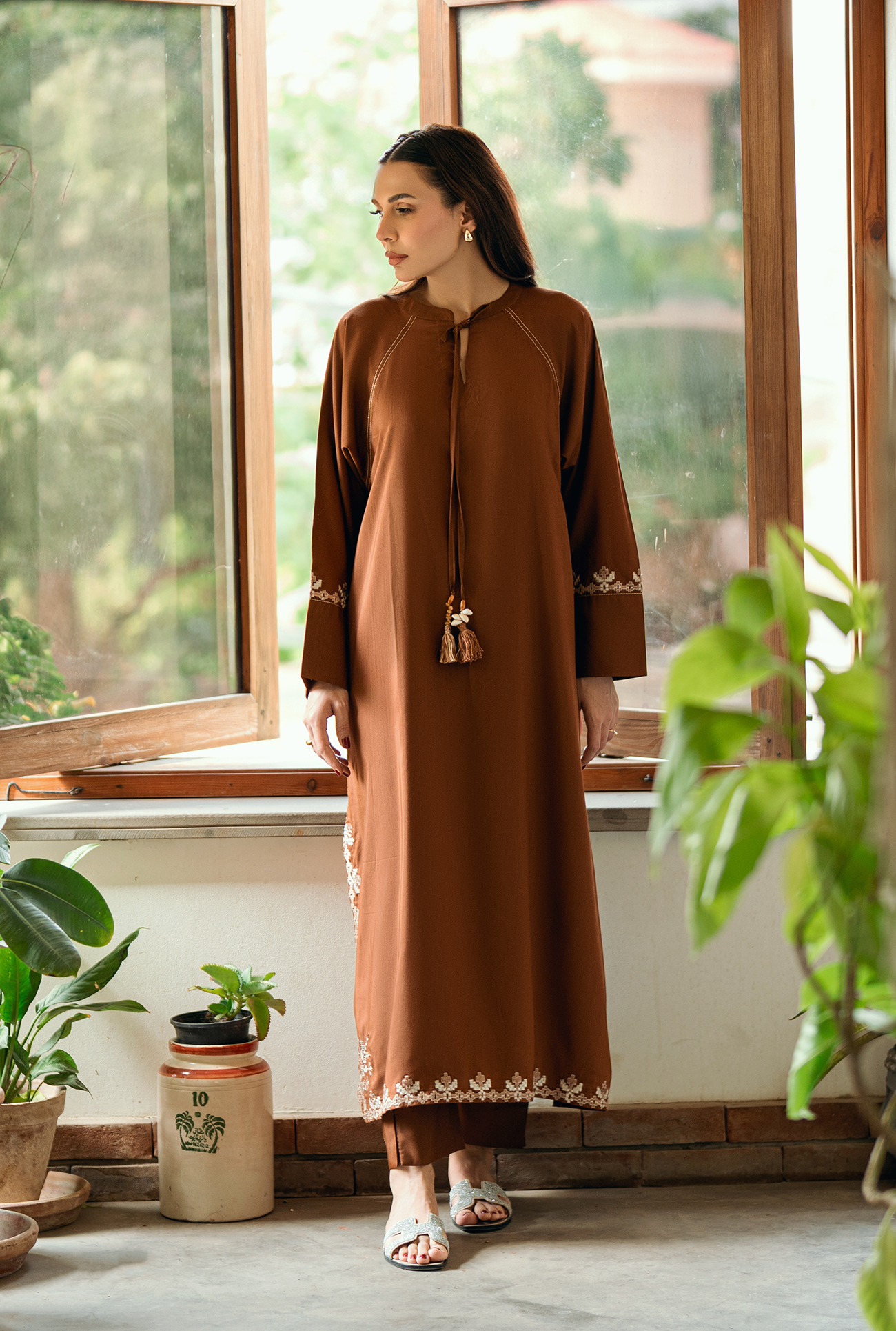 Brown Silsila two-piece set featuring raglan sleeves and regular side slits, with minimal embroidery on the sleeves, hem, and slits. Designed with a soft band collar, tassel-tied strings, and paired with Basics matching straight pants. Model is wearing Small size