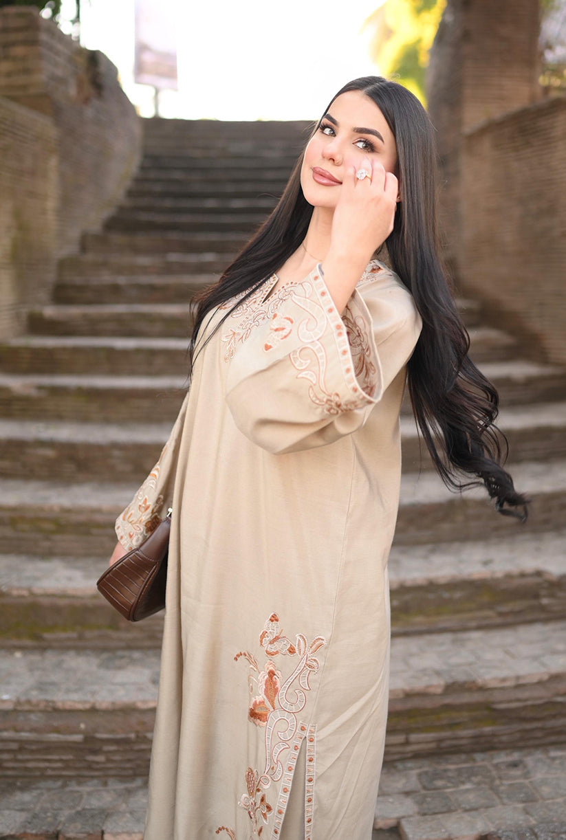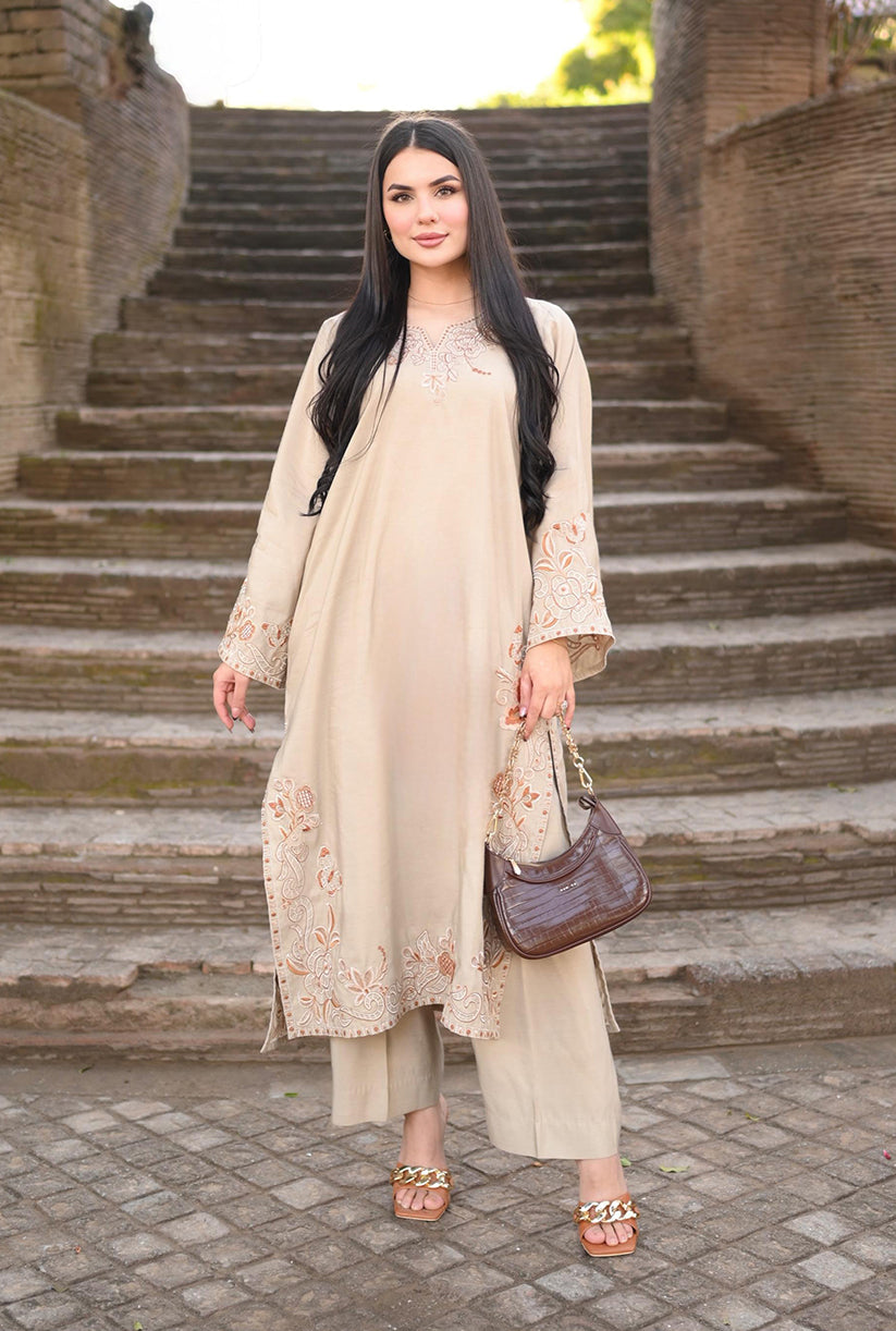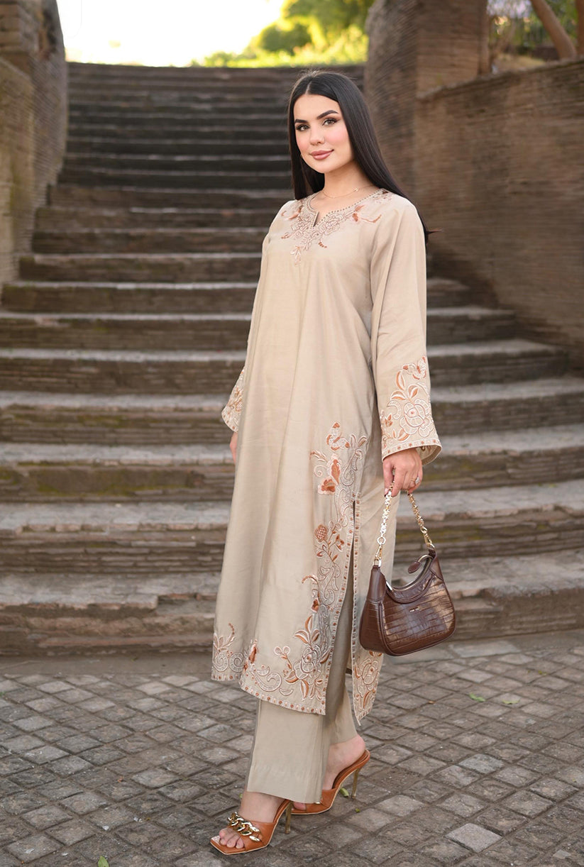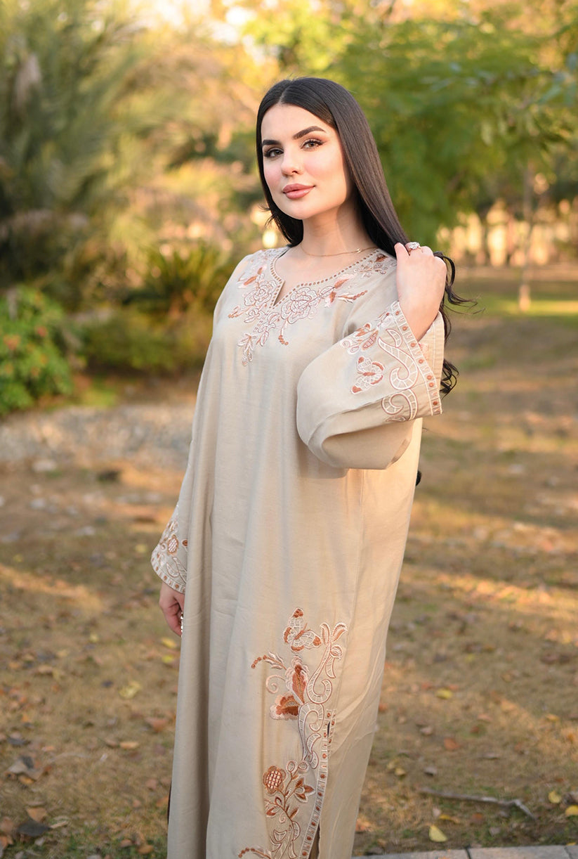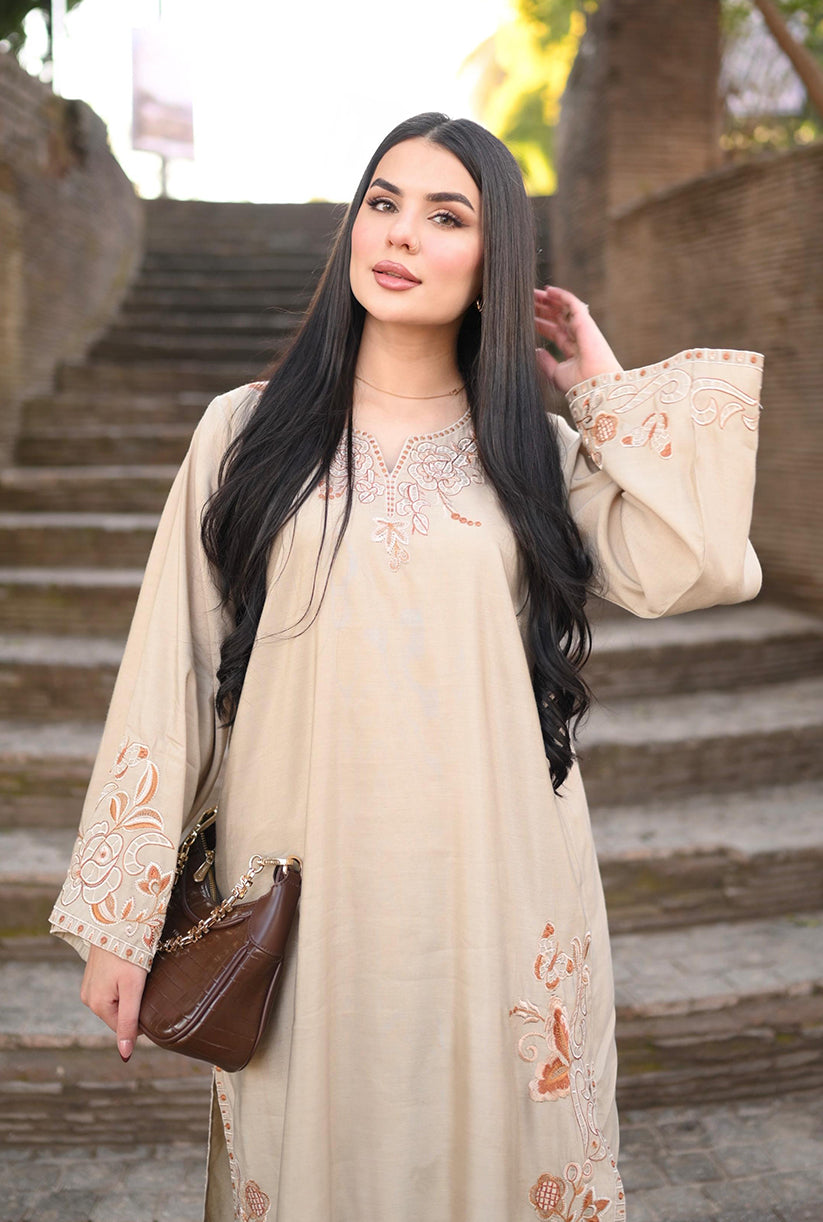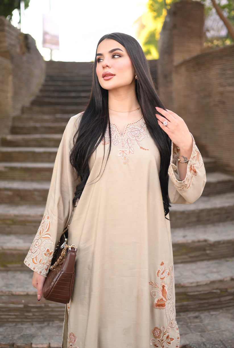 Soft Dune showcases a refined beige palette with delicately embroidered details along the front, sleeves, and borders, complemented by a graceful neckline accent. Crafted in premium fabric with an elegant drape, the long shirt is paired with a loose, tailored bottom for a timeless and effortlessly chic look. Perfectly balancing sophistication and comfort, this outfit is your go-to choice to refresh your style and elevate your wardrobe with understated elegance