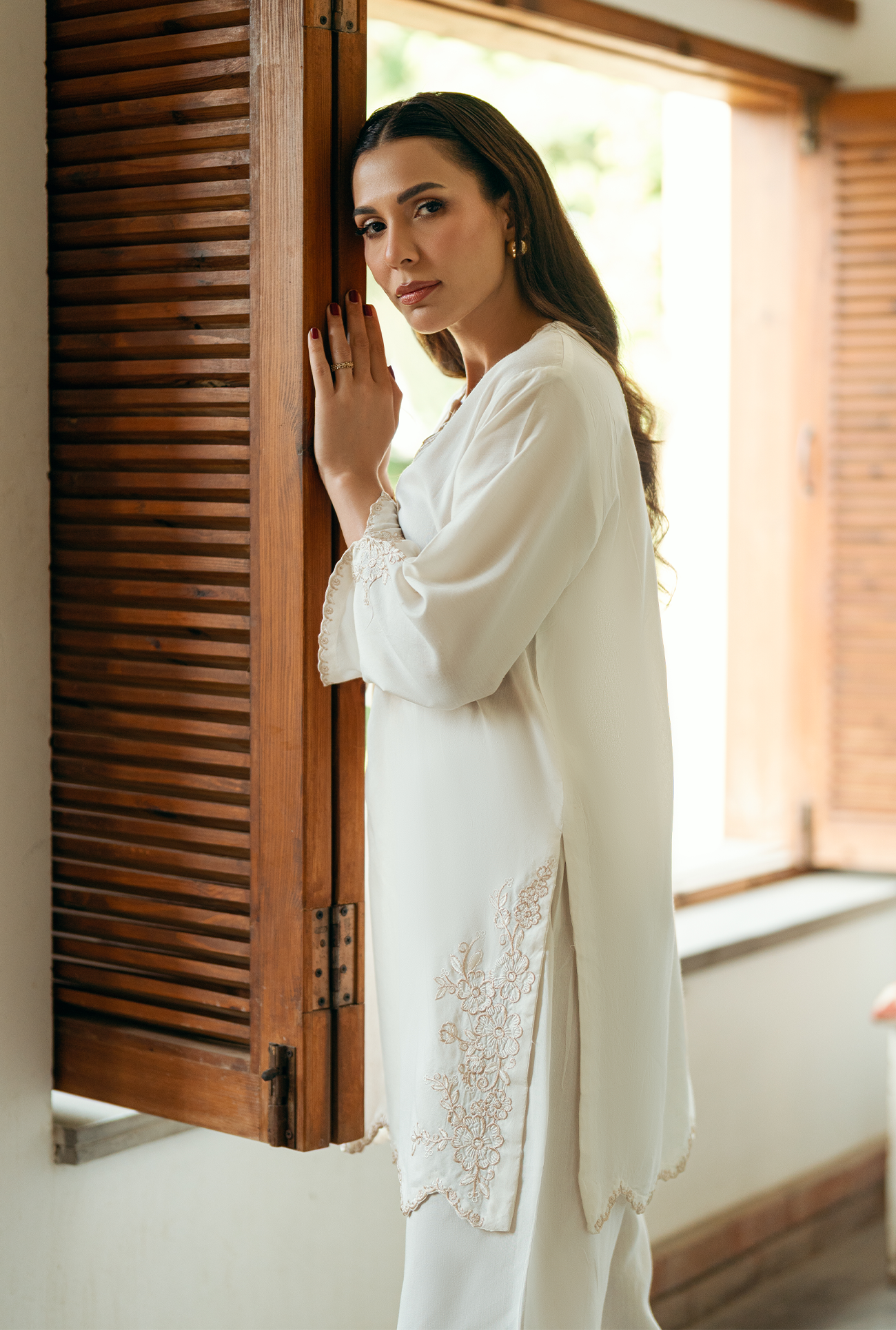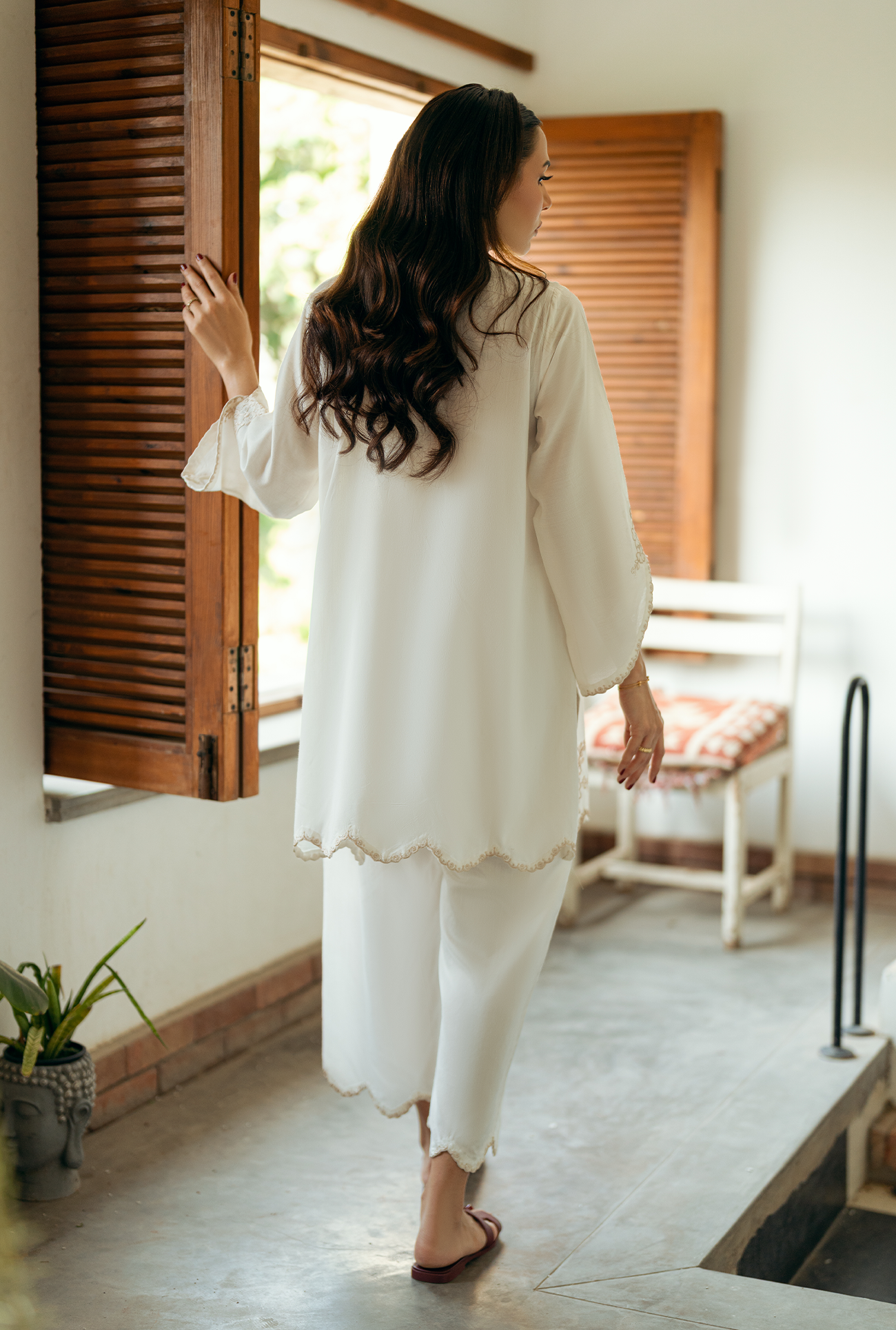A pristine white Sufi set featuring a round neckline with a V-slit, scalloped hem, bell sleeves, and wide-leg culottes with matching minimal scalloped embroidery. Model is wearing Small size