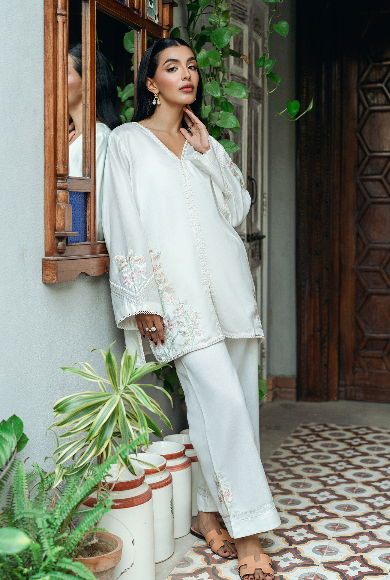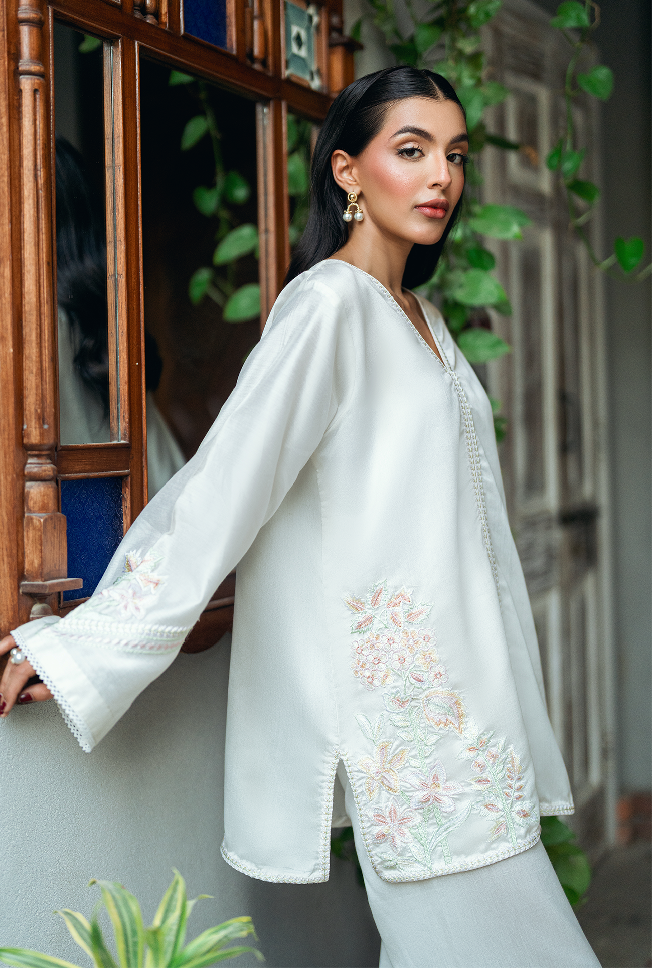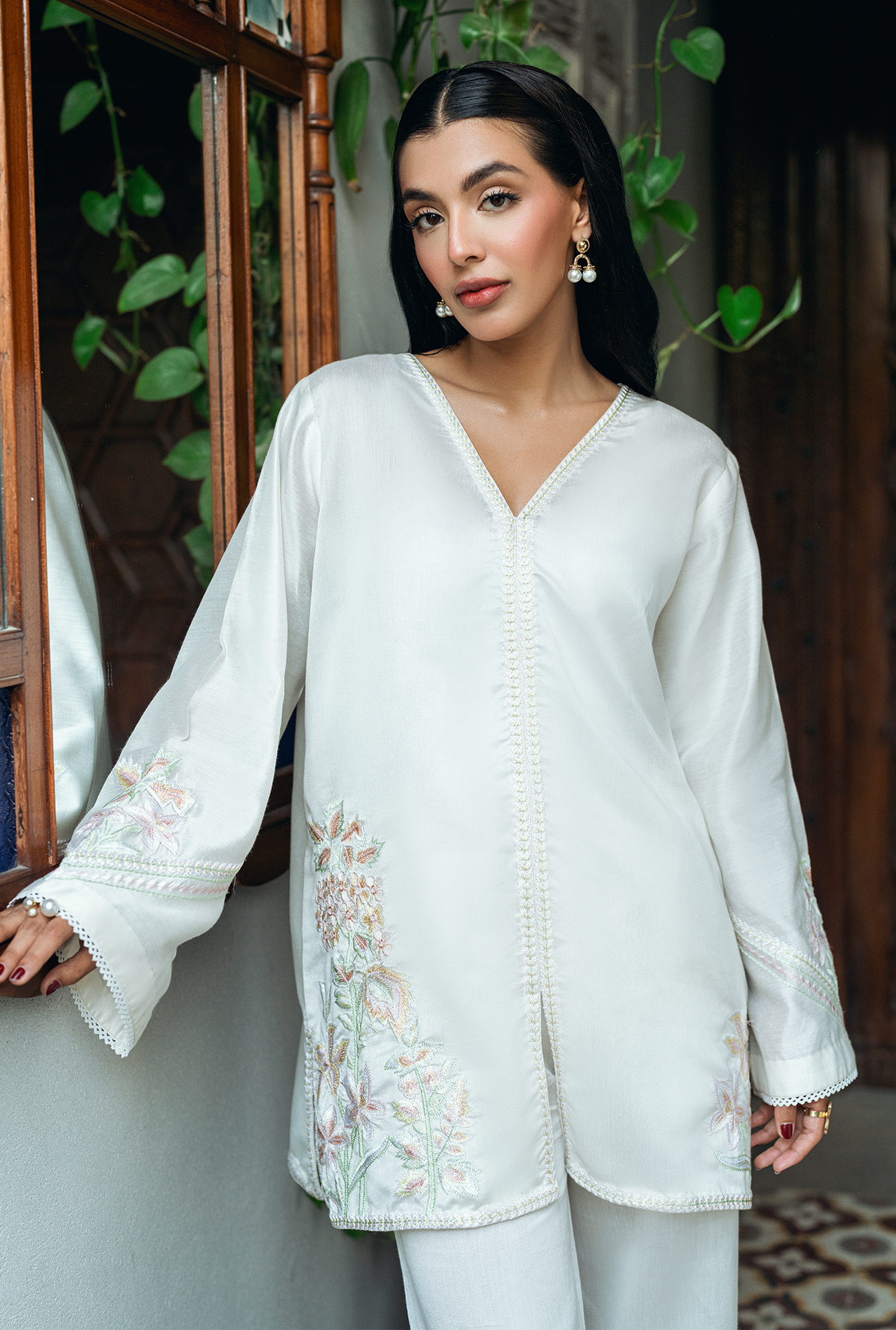 An ivory white short shirt featuring intricate embroidery along the V-neckline and hem, paired with full sleeves and matching embraided culottes. Model is wearing Small size