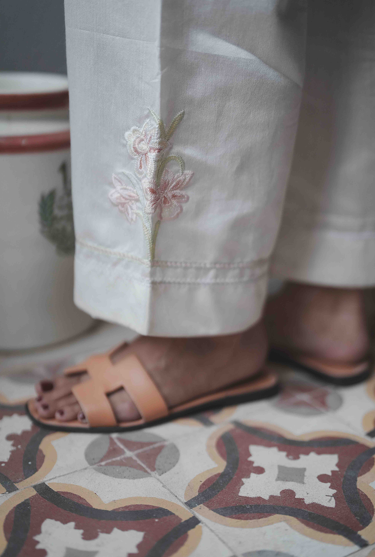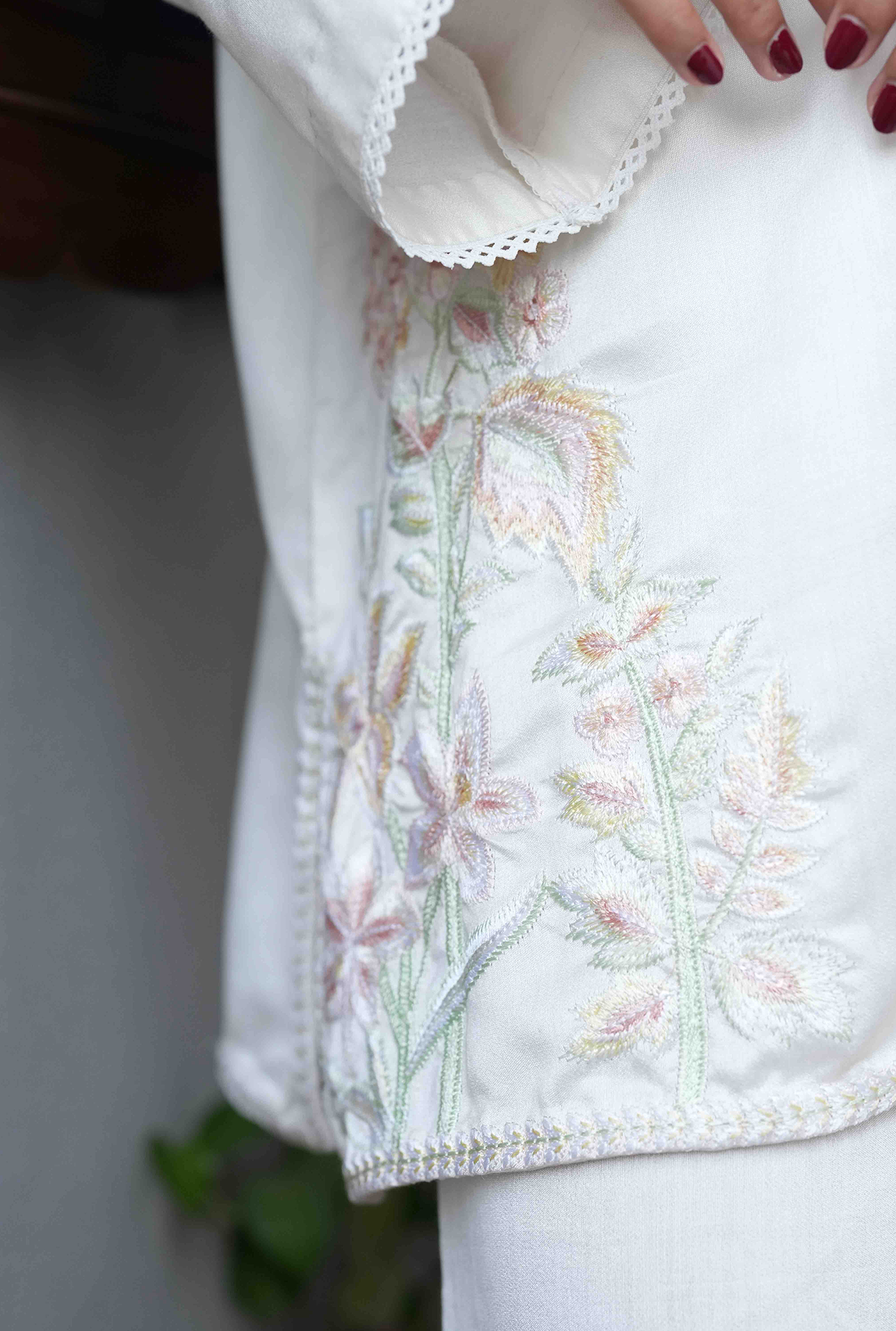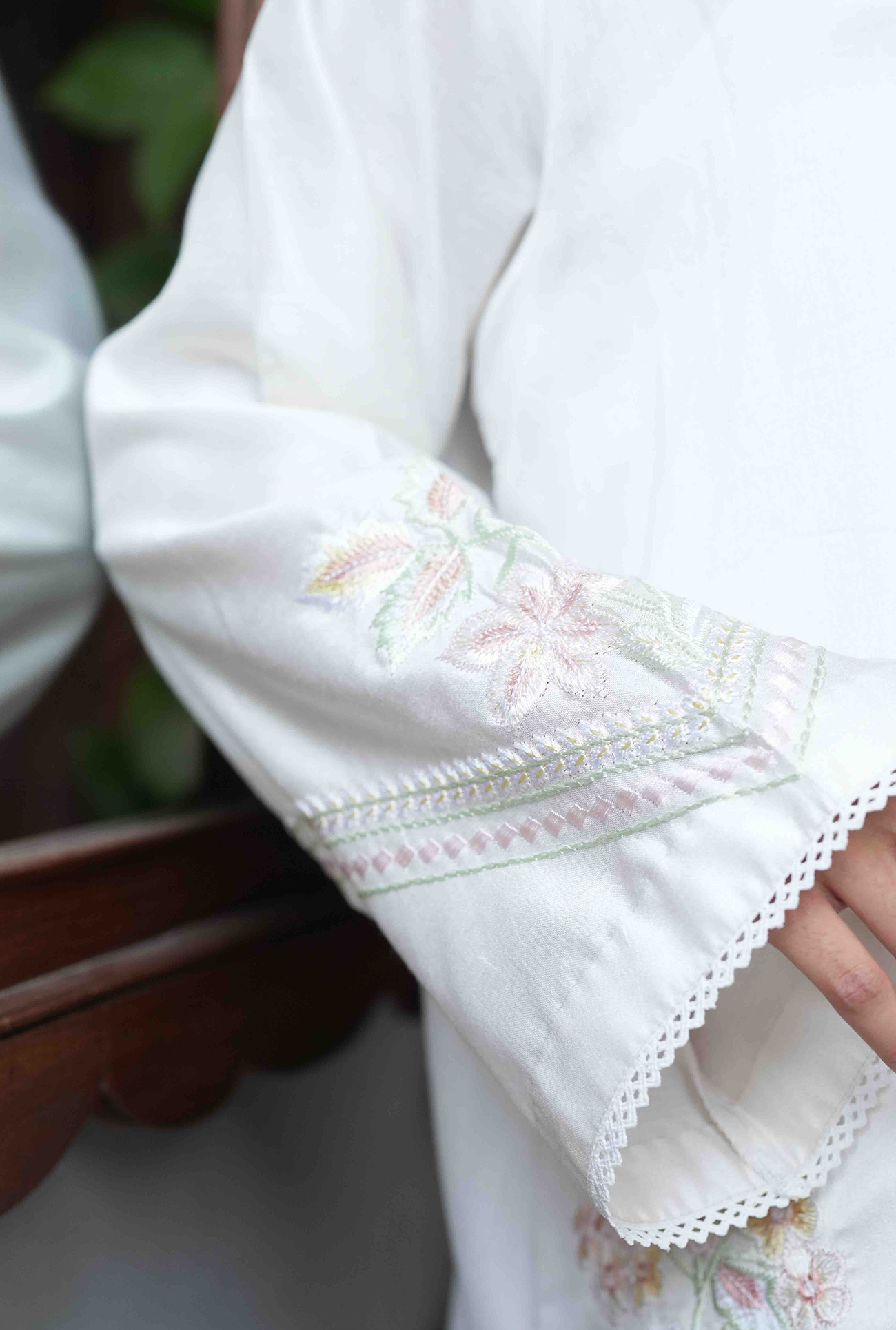 An ivory white short shirt featuring intricate embroidery along the V-neckline and hem, paired with full sleeves and matching embraided culottes. Model is wearing Small size