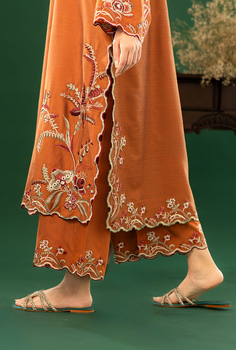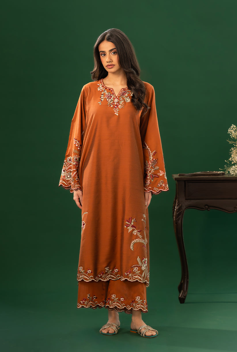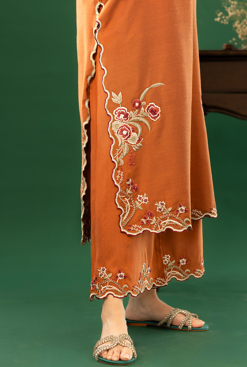 Tangerine Quartz is designed with a delicately embroidered front, finished with a scalloped daman and soft floral detailing that elevates its graceful neckline. Made from premium cotton silk and paired with intricate embroidered culottes, this ensemble offers the perfect balance of effortless elegance and modern sophistication a refreshing addition to your everyday wardrobe.