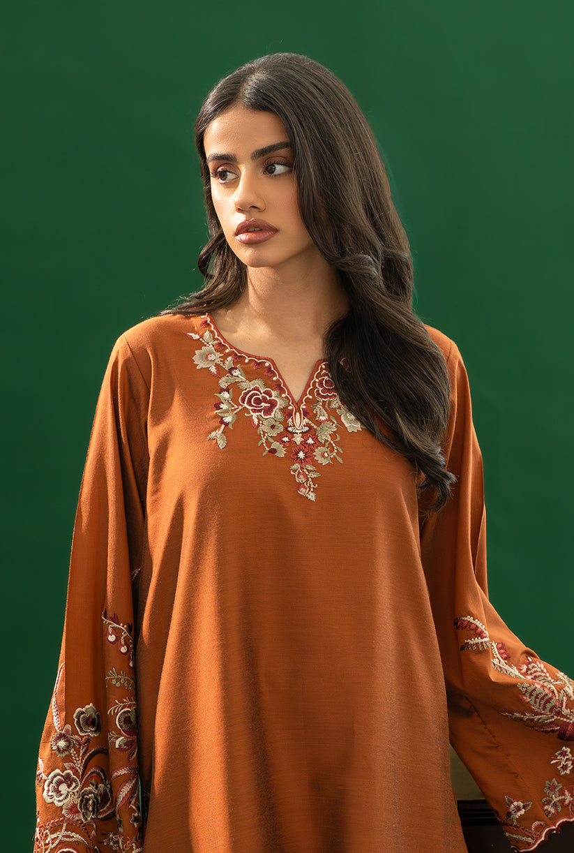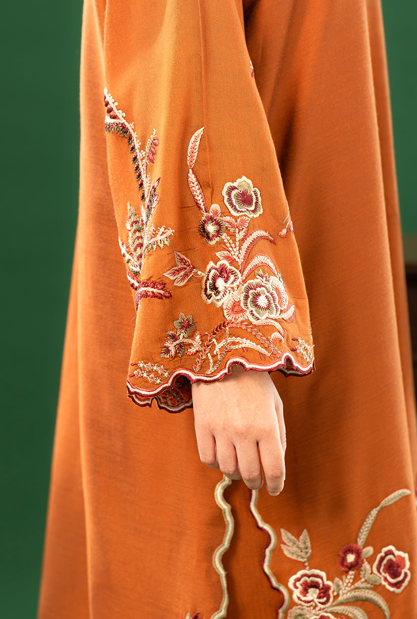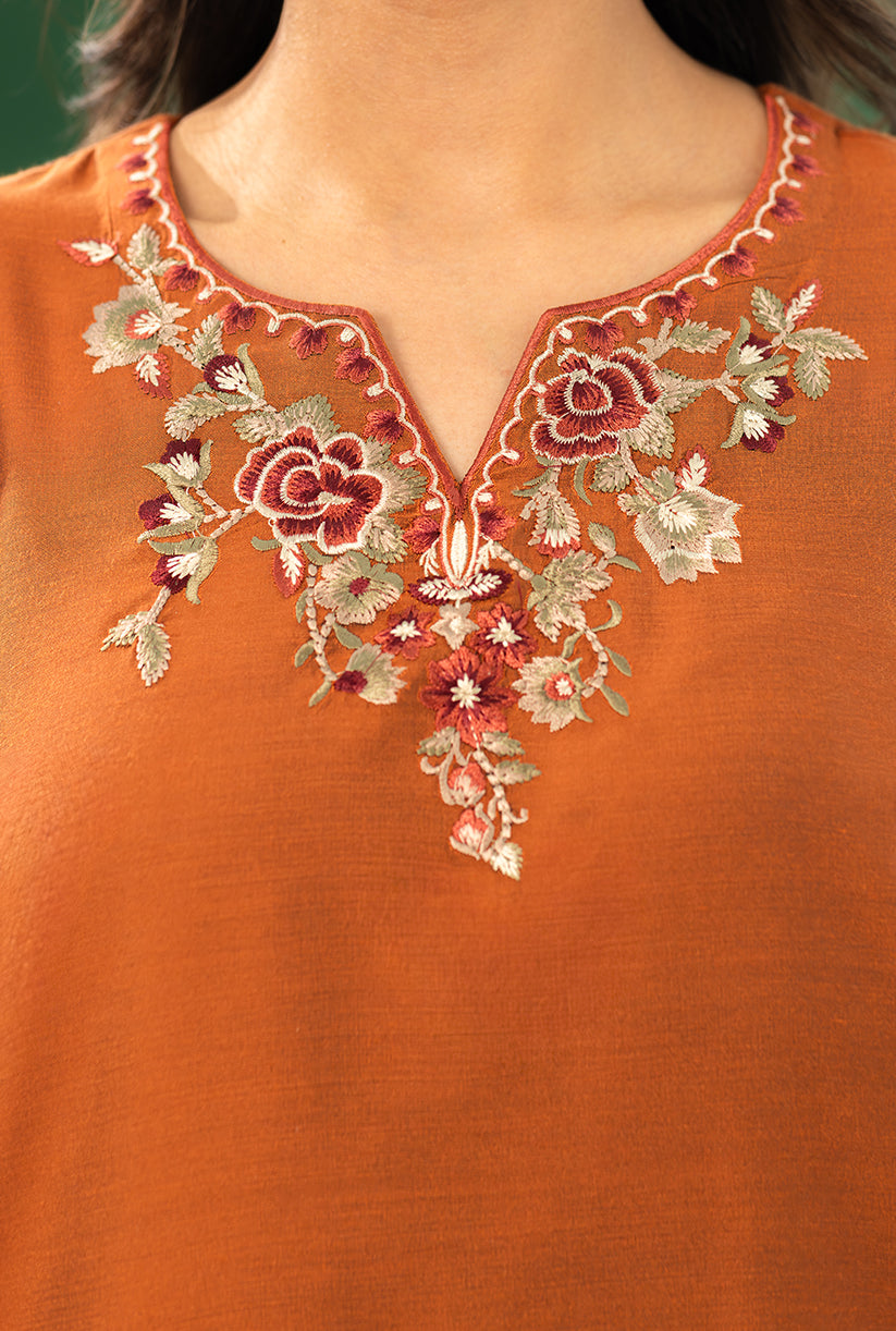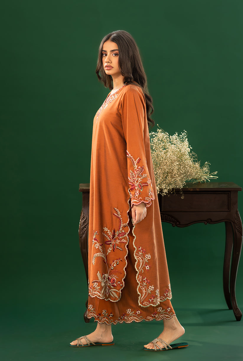 Tangerine Quartz is designed with a delicately embroidered front, finished with a scalloped daman and soft floral detailing that elevates its graceful neckline. Made from premium cotton silk and paired with intricate embroidered culottes, this ensemble offers the perfect balance of effortless elegance and modern sophistication a refreshing addition to your everyday wardrobe.